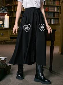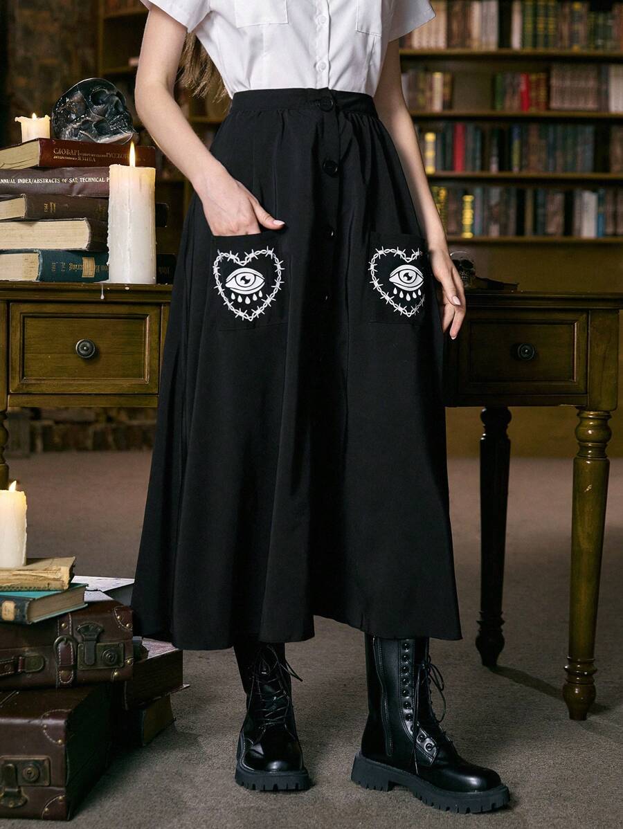 Deniart Academia Falda con estampado de ojo con botón delantero con doble bolsillo