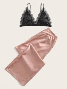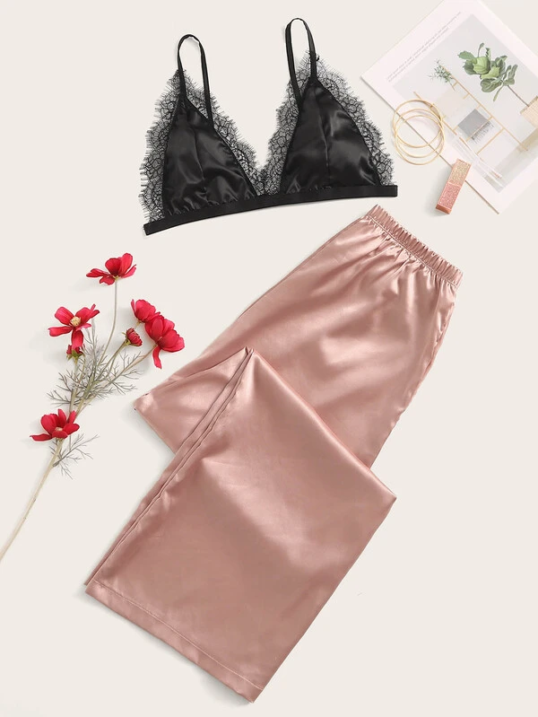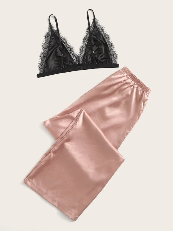 Conjunto de pijama sujetador de staén con encaje de pestaña con pantalones