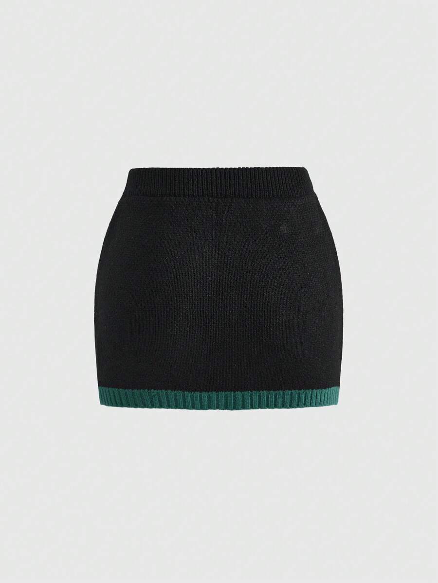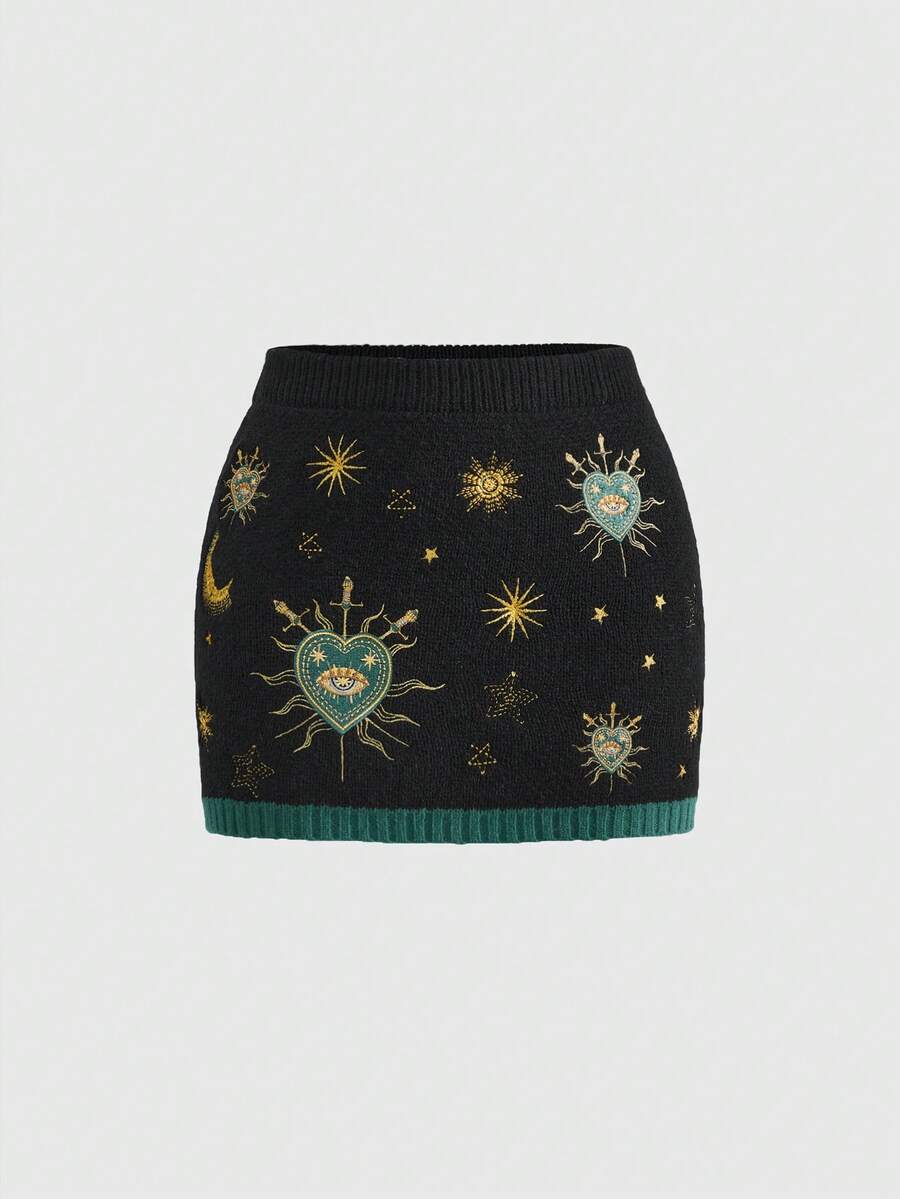 Goth Conjunto de suéter y falda de cintura baja con bordados contrastantes de sol, luna, estrella, corazón y ojo, con estilo de bruja misteriosa de hadas