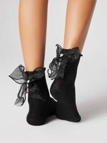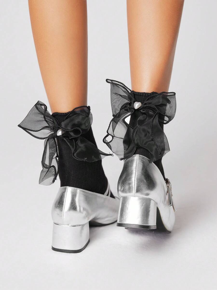 Fairycore 1 par de calcetines hasta la pantorrilla para mujer con diseño de arco de malla y decorados con perlas, versátiles para todas las estaciones, estilo kawaii