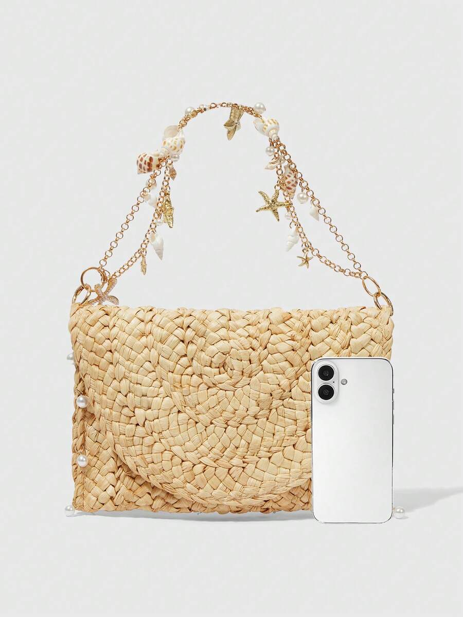 Fairycore 1 pieza Bolso de mano de diseño de nicho de resort de playa con conchas, perlas falsas y diseño elegante y dulce, hecho a mano para mujer