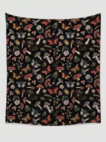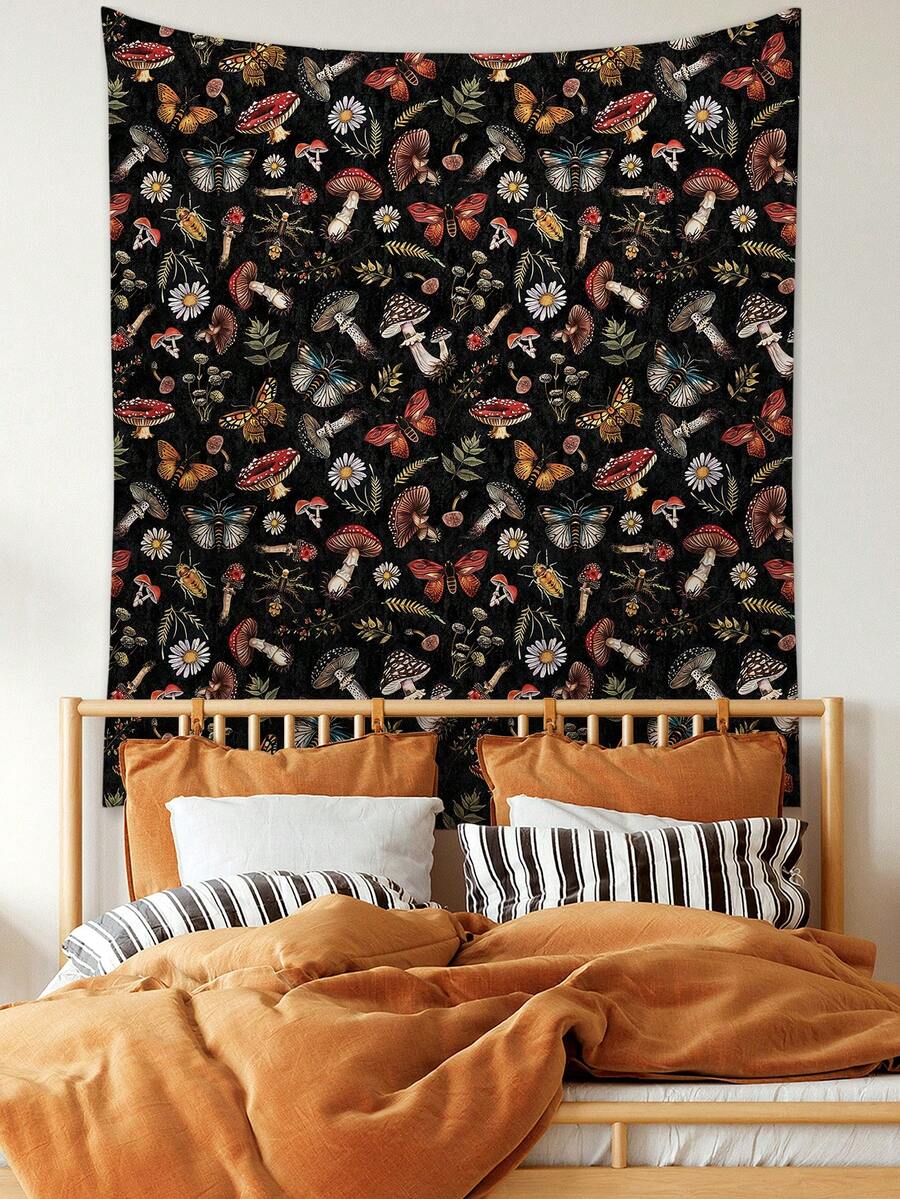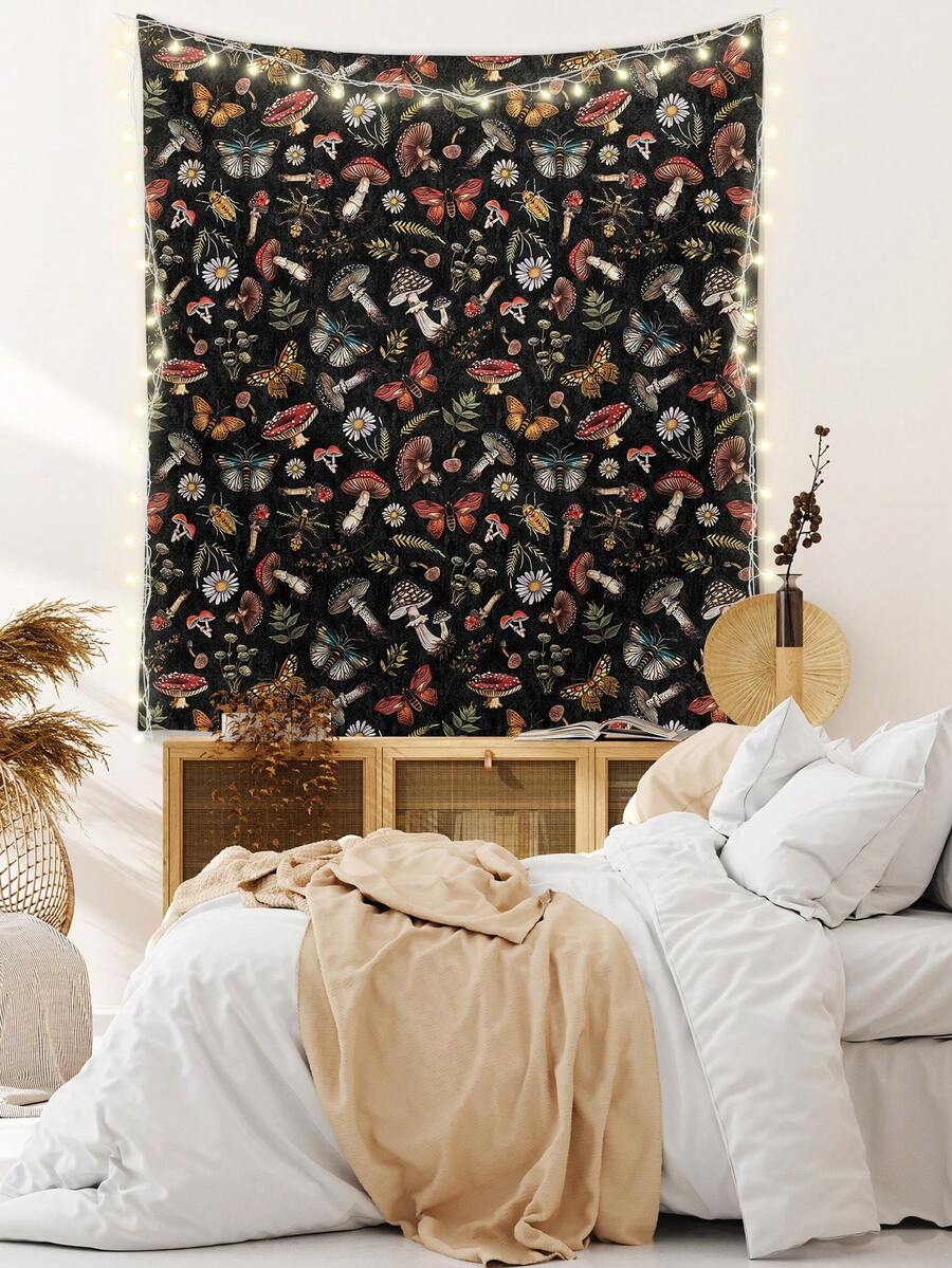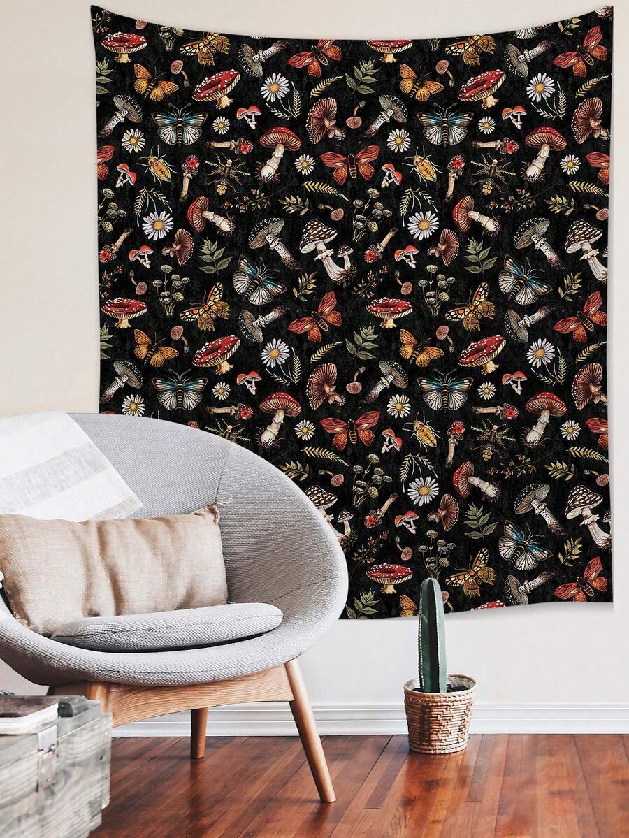 Fairycore 1 pieza Tapiz de poliéster con estampado retro tipo Mori de mariposa, seta y planta, adecuado para decoración de pared en sala de estar, dormitorio, decoración para acampar, tapiz colgante para las 4 estaciones, Artículo n.º 999275