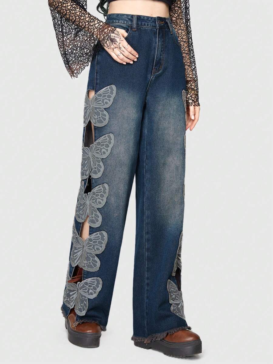 Fairycore Jeans de pierna recta con bordado de mariposa