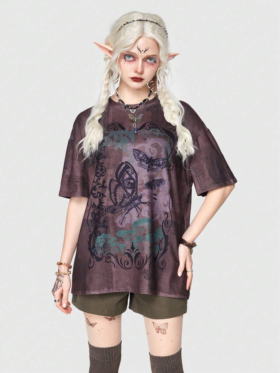 Fairycore Camiseta de hombros caídos con estampado de mariposa sin manga