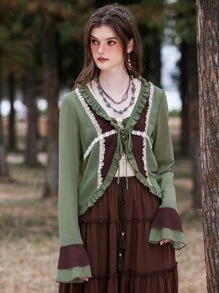 Fairycore Top con encaje en contraste con cordón delantero bajo con fruncido