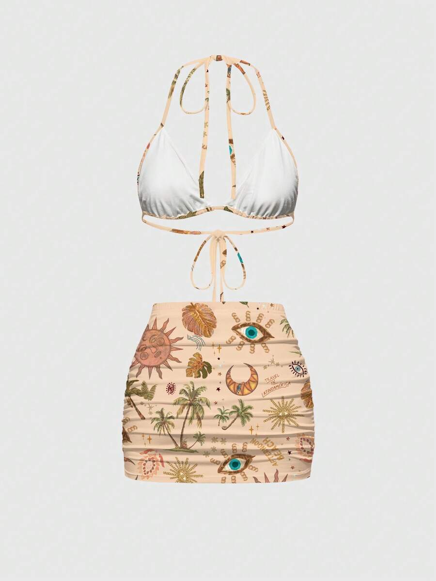 Fairycore Conjunto de 2 piezas de mujer con estampado todo sobre de ojos oscuros, sol, luna, estrella y árbol de coco, con camiseta de tirantes y minifalda ajustada para vacaciones sexy