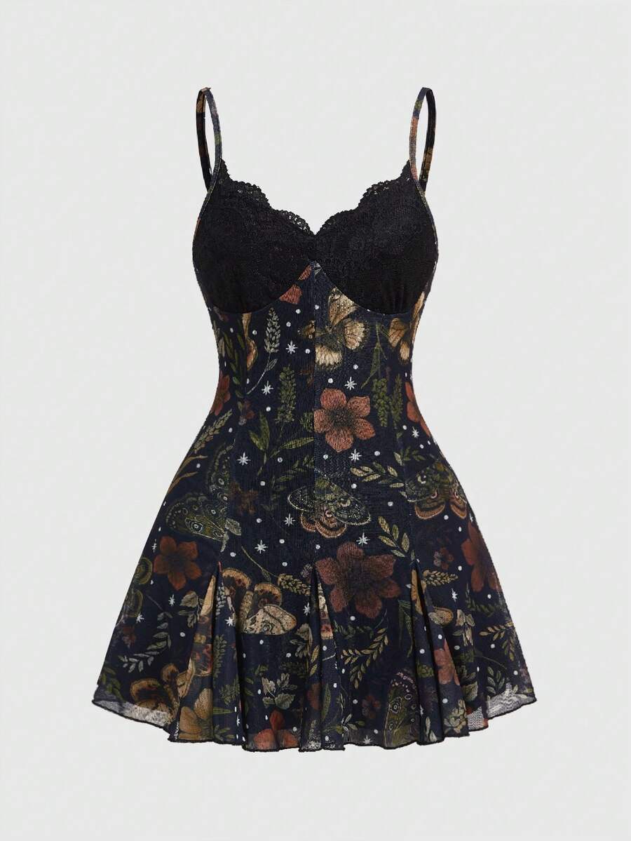 Fairycore Vestido mini con tirantes finos, de corte holgado, con estampado floral bohemio, romántico y gótico para mujeres