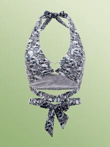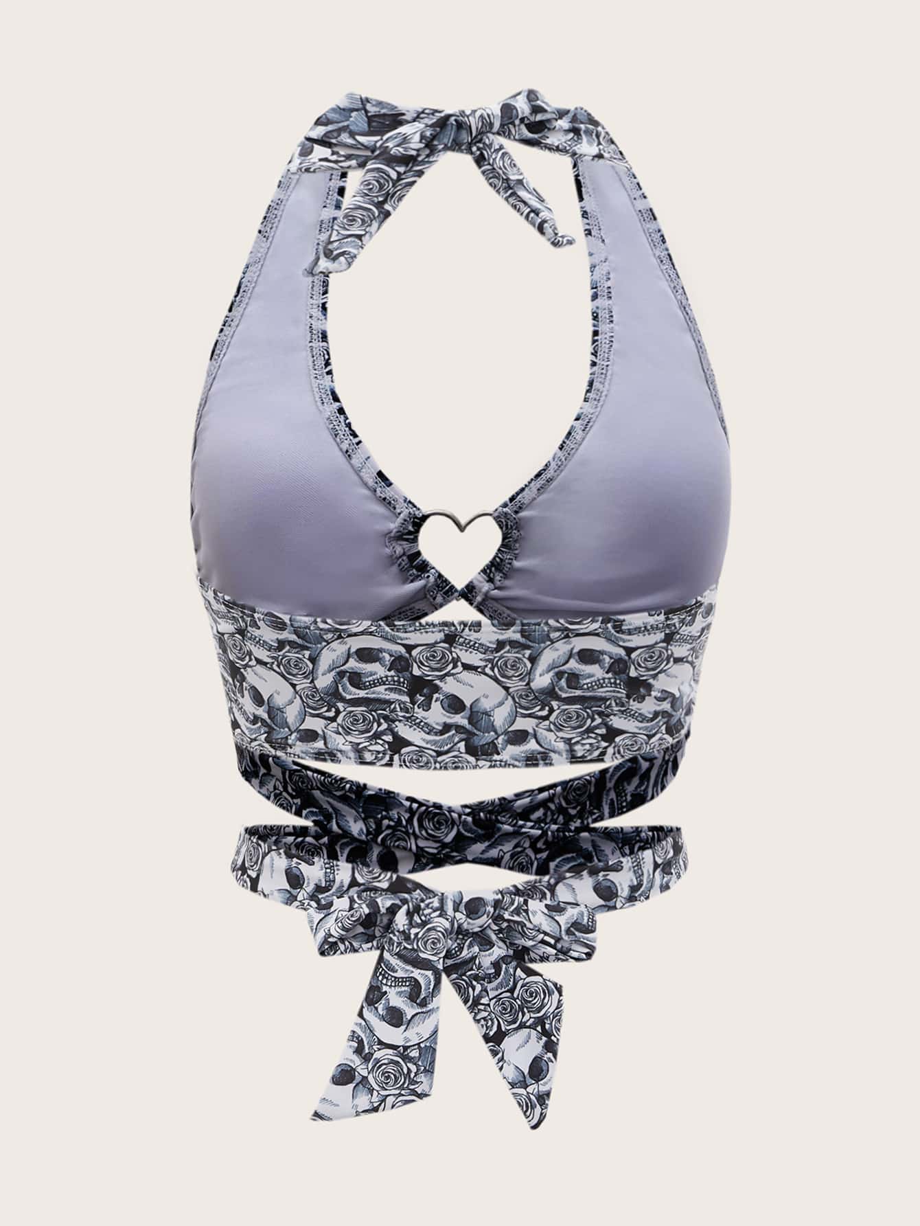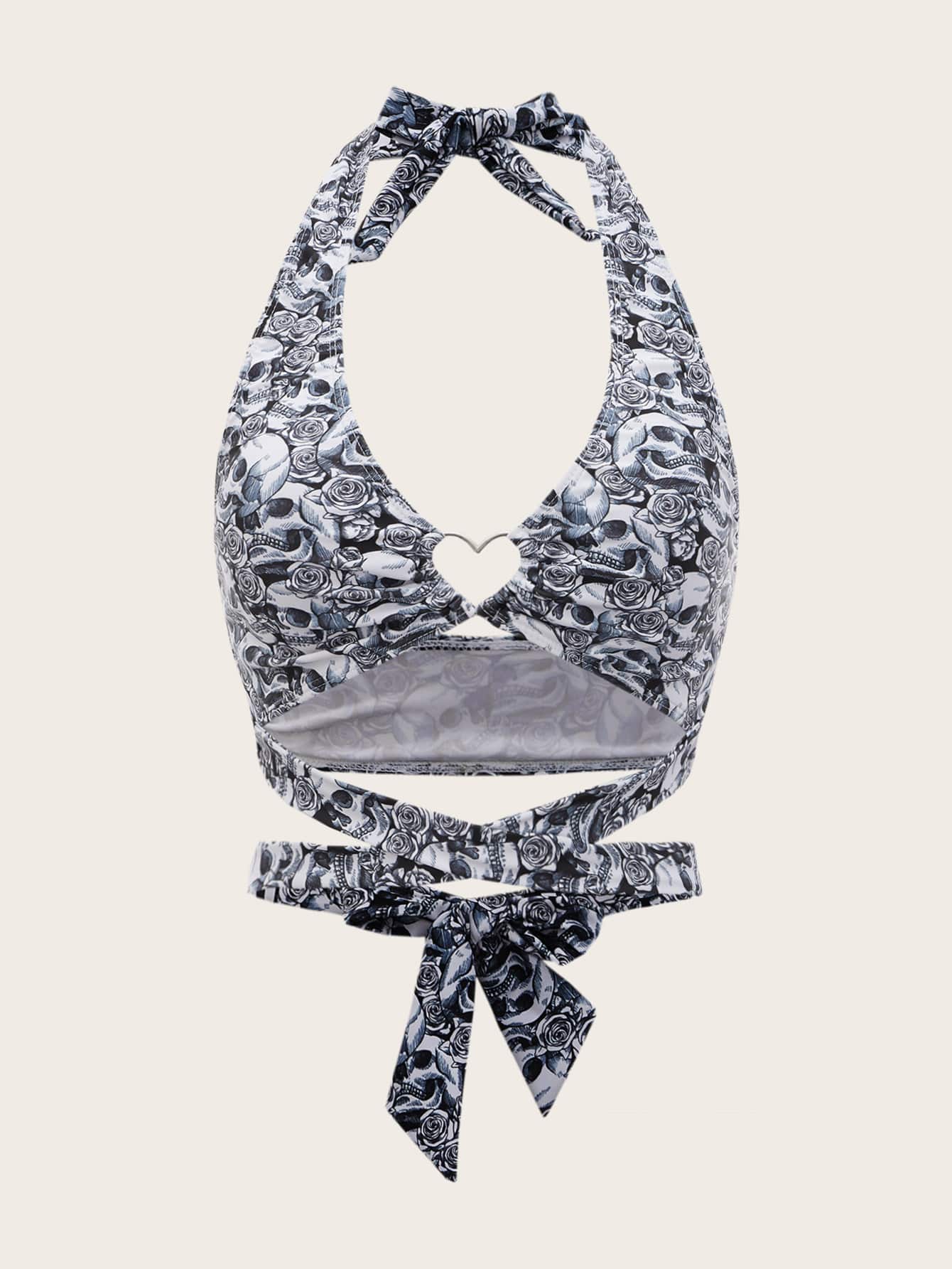 Fairycore Top bikini halter floral & con estampado de cráneo con tira cruzada
