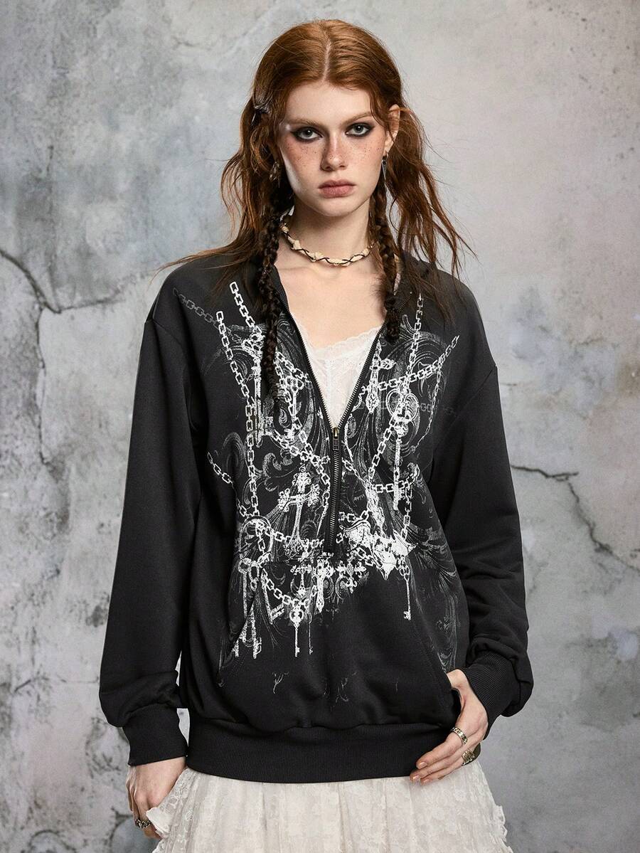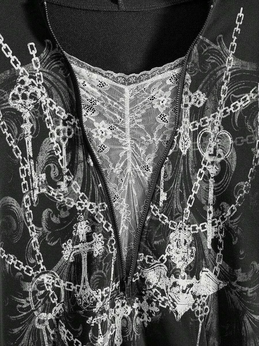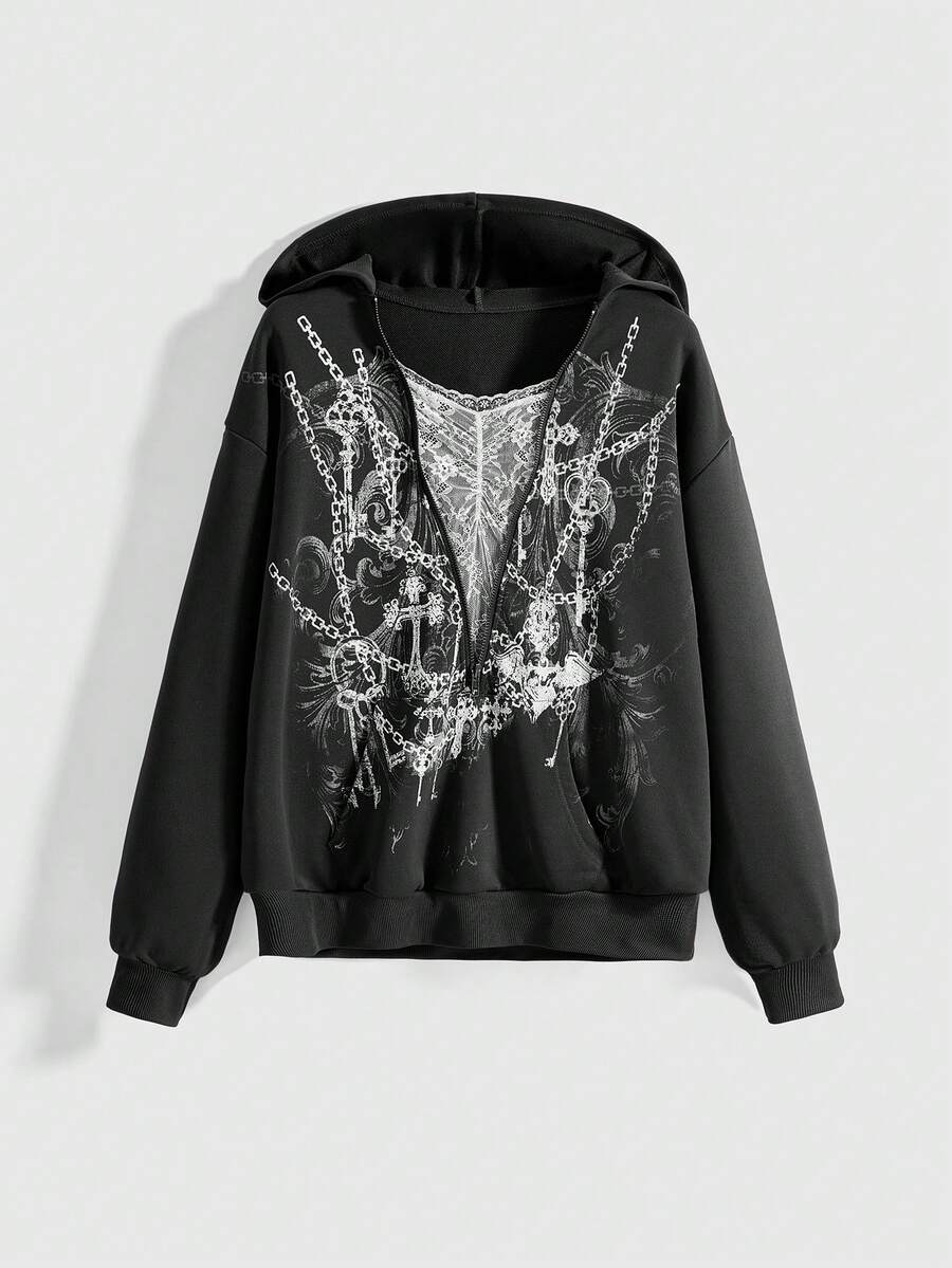 Fairycore Sudadera holgada con capucha, mangas de murciélago y cremallera con encaje en estilo Kpop Wasteland para mujeres