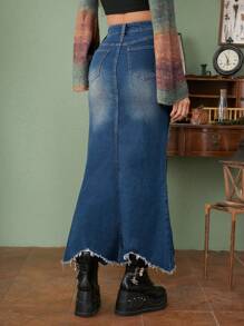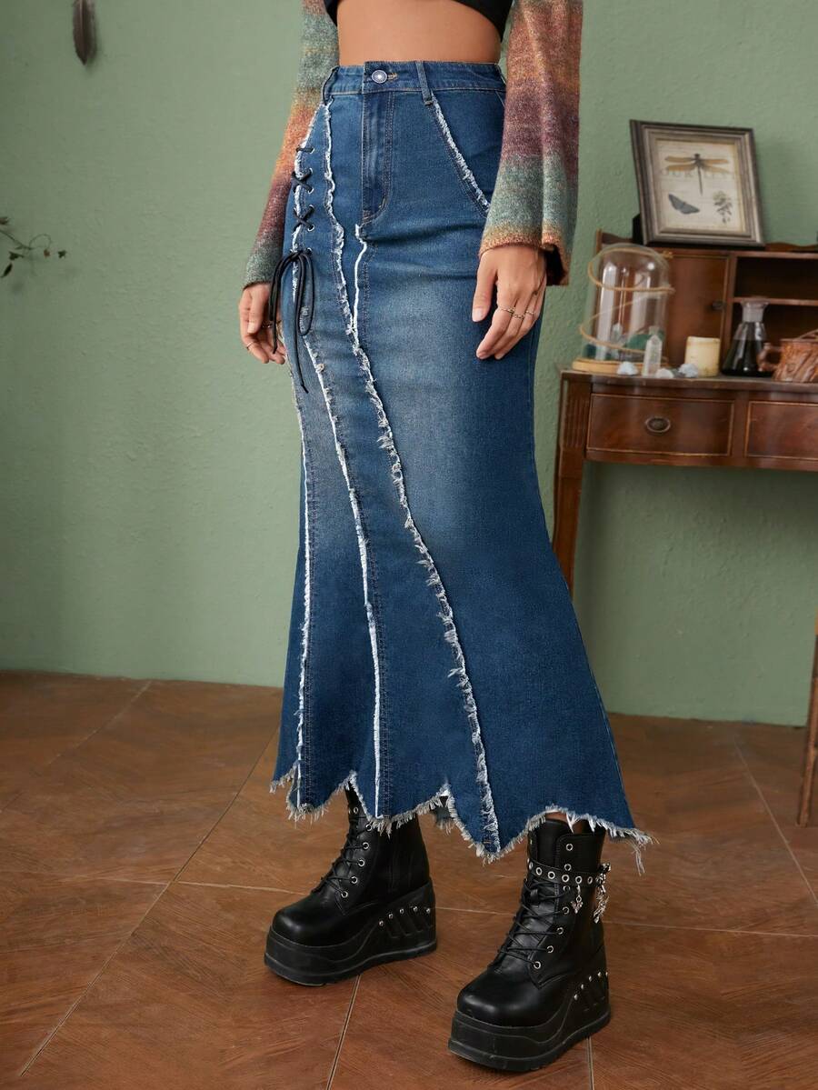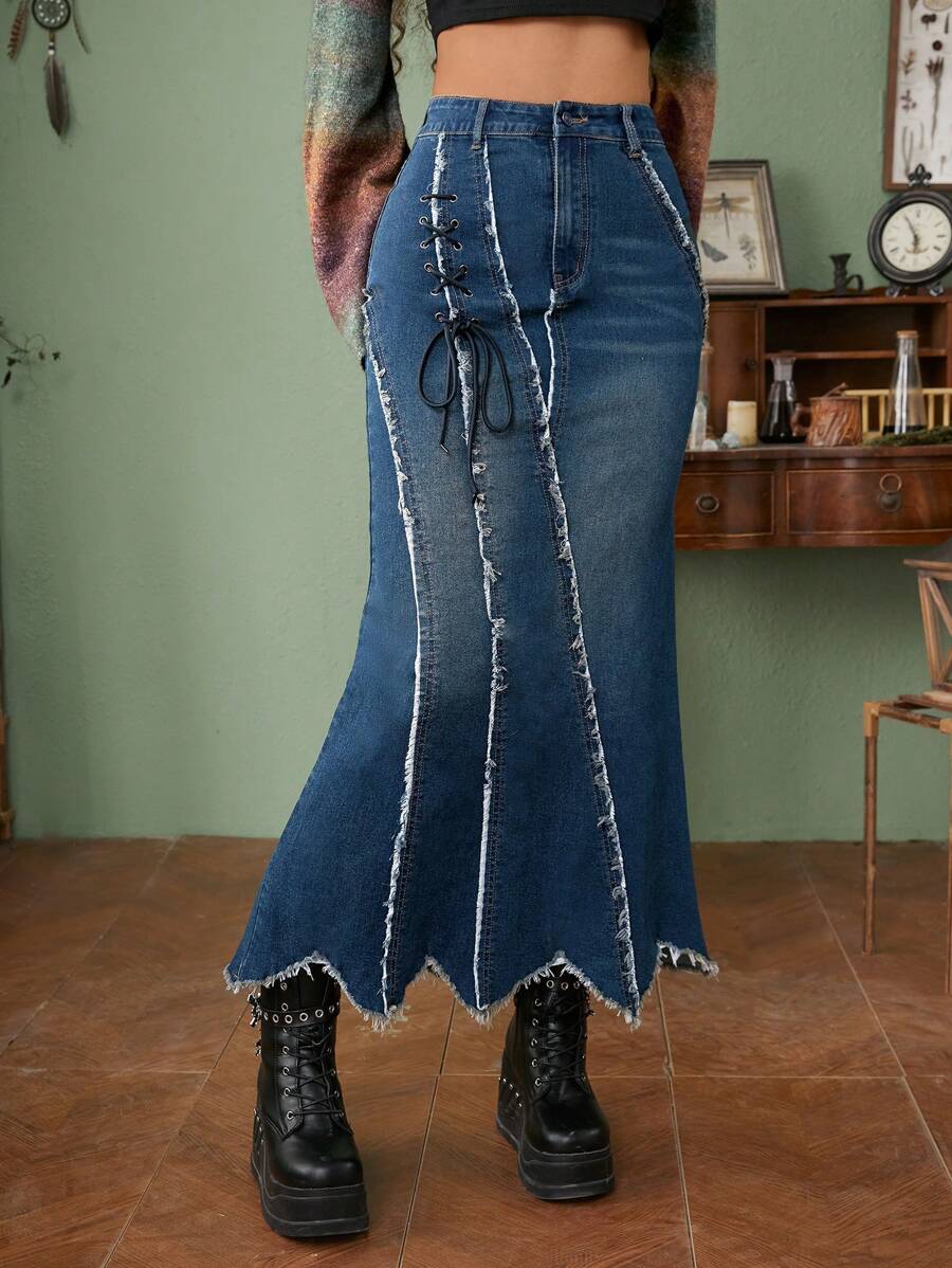 Fairycore Falda en mezclilla con cordón delantero ribete crudo bajo sirena