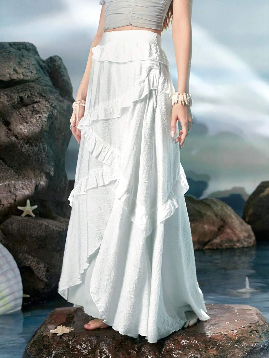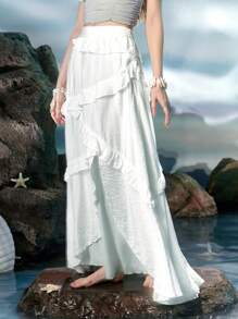Fairycore Sirena Falda con dobladillo asimétrico con ribete de volantes lisos