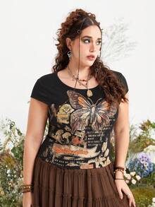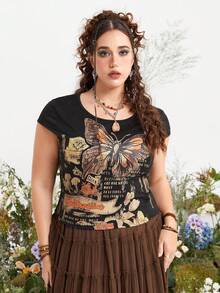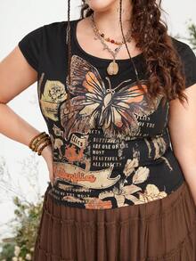 Fairycore Talla grande Camiseta con estampado de mariposa y slogan