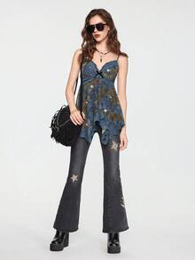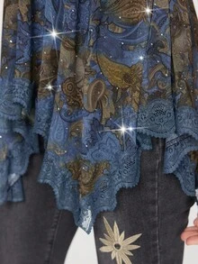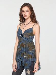 Hippie Camiseta asimétrica con dobladillo de encaje de parche de flores vintage y cristales de estilo Fairycore