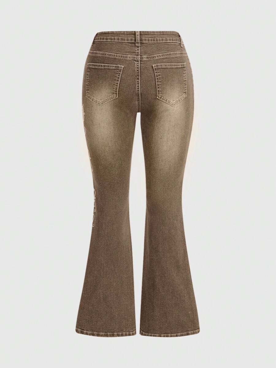 Fairycore Jeans de talle bajo con efecto skinny y campana para mujer de talla grande, con bordado jacquard de mariposas y rosas en estilo vintage Y2K