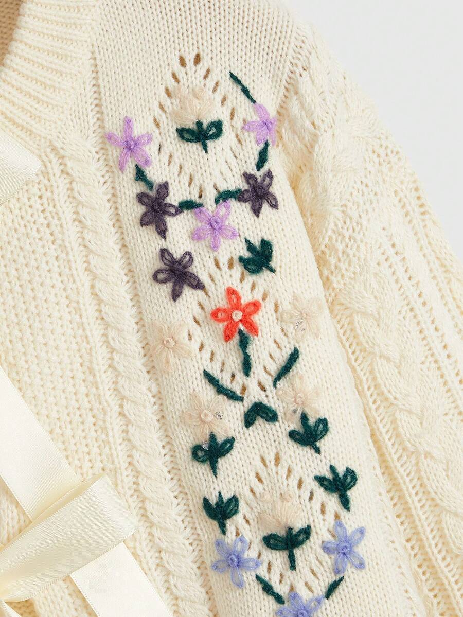 Fairycore Cárdigan con lazo de cinta con bordado floral en el frente para mujeres