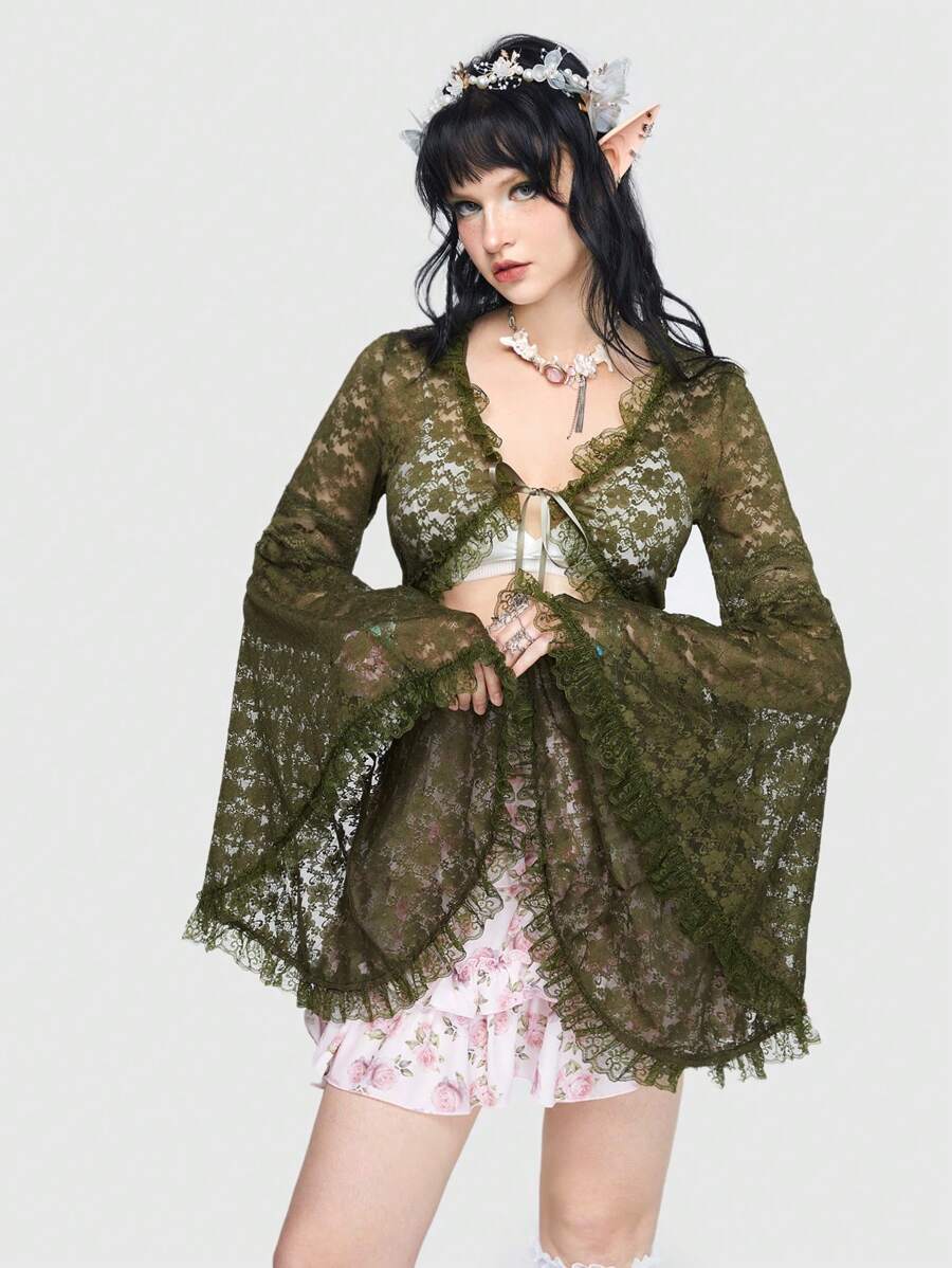 Fairycore Top Corto De Encaje Con Mangas Onduladas Para Mujer