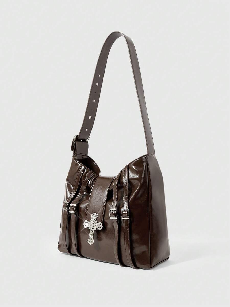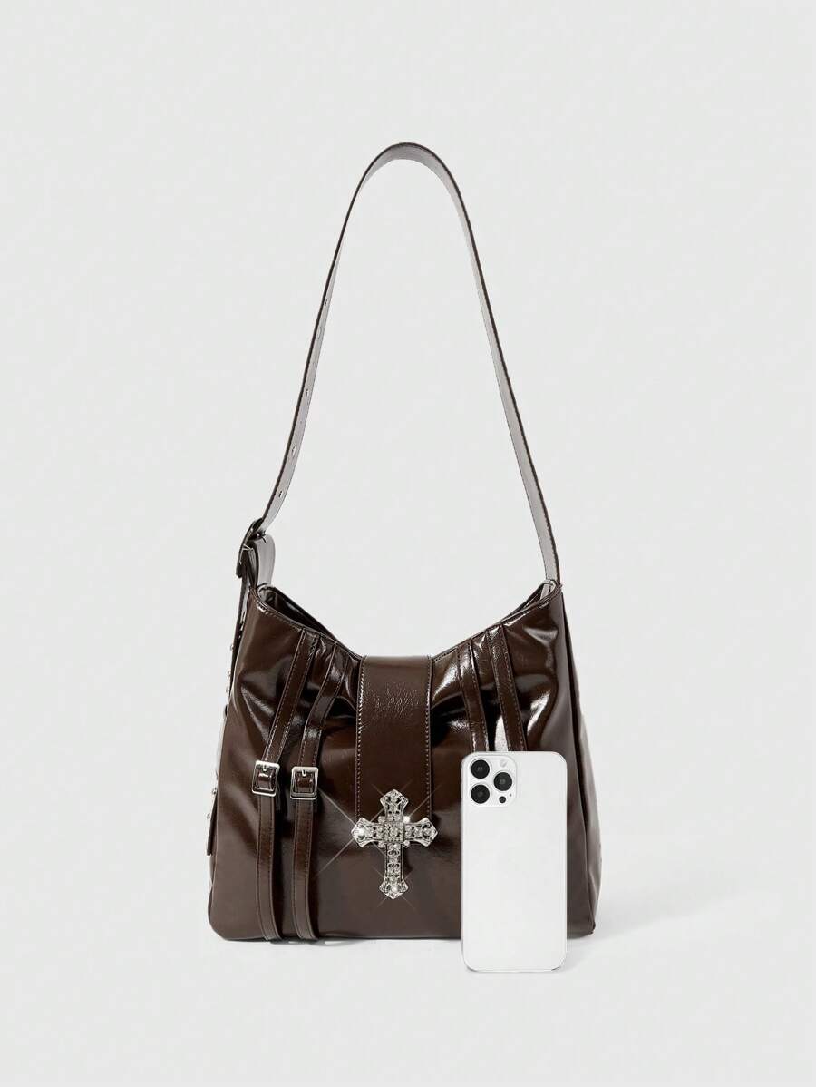 Fairycore Bolso cruzado vintage estilo bohemio marrón de mujer con hebilla y dije de cruz con strass, correa ajustable para festivales de música y fiestas de carnaval