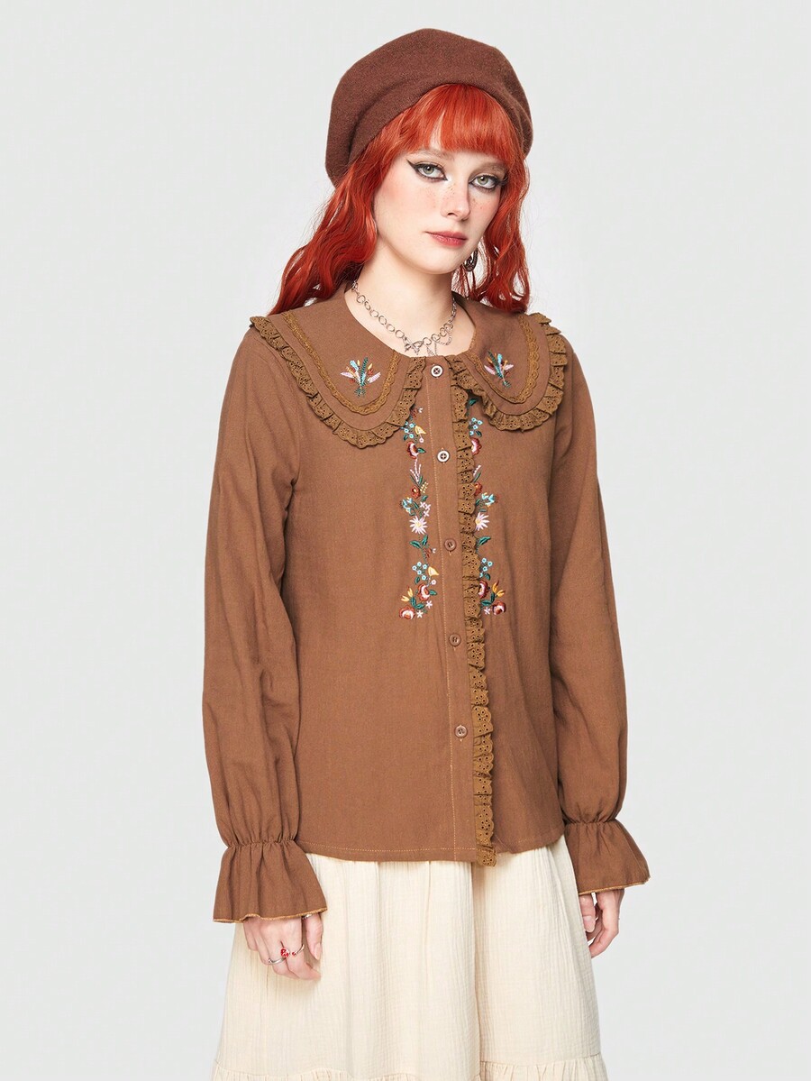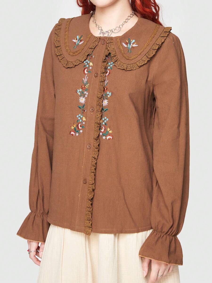 Fairycore Camisa de mujer con cuello Peter Pan y bordado floral