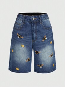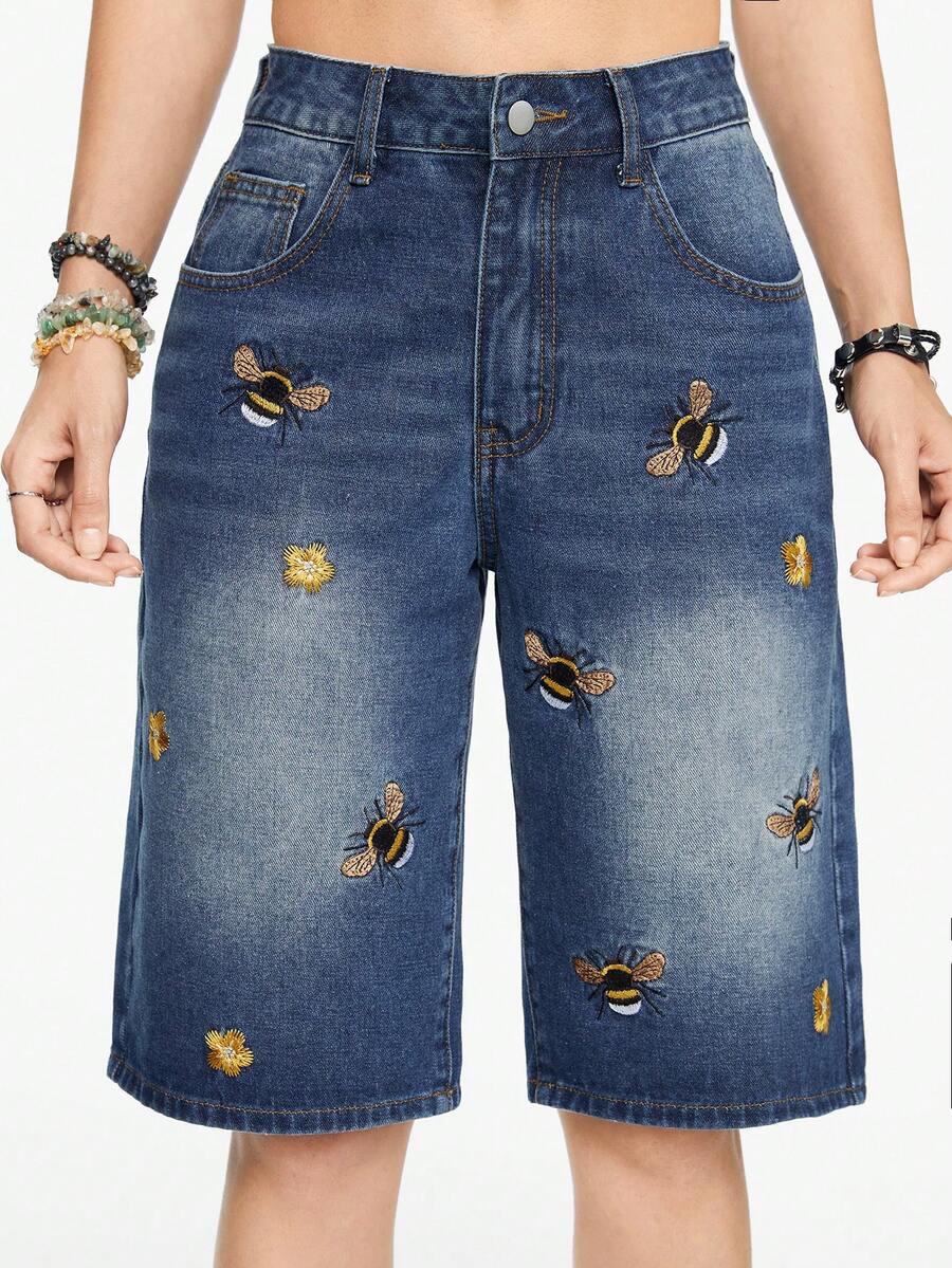 Fairycore Shorts de mezclilla bordados con diseño de abejas y flores para mujer, shorts bermudas