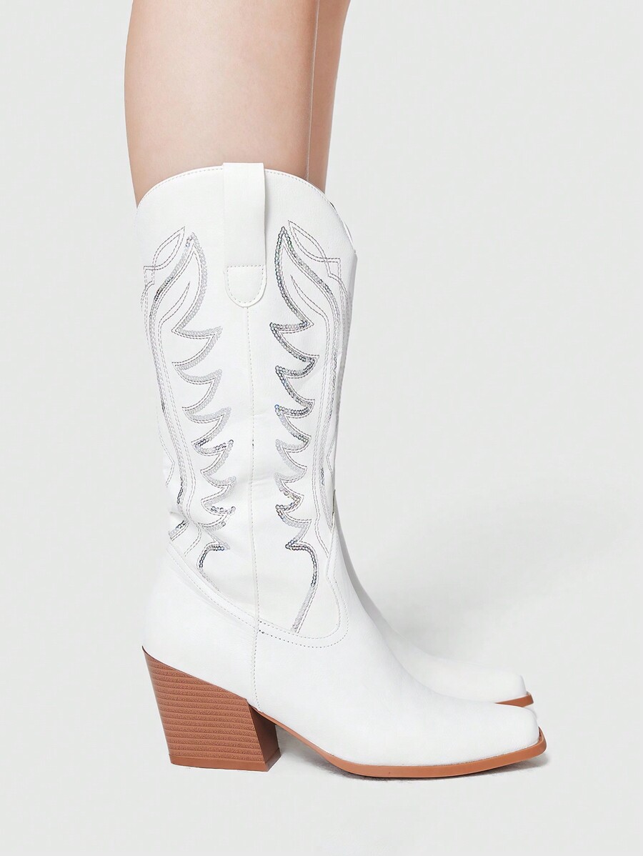 Fairycore Botas elegantes de tacón grueso y punta fina con bordados para mujer, botas vaqueras, botas de media caña con diseño occidental y deslizamiento, botas de vaquera, nuevas llegadas de primavera y otoño