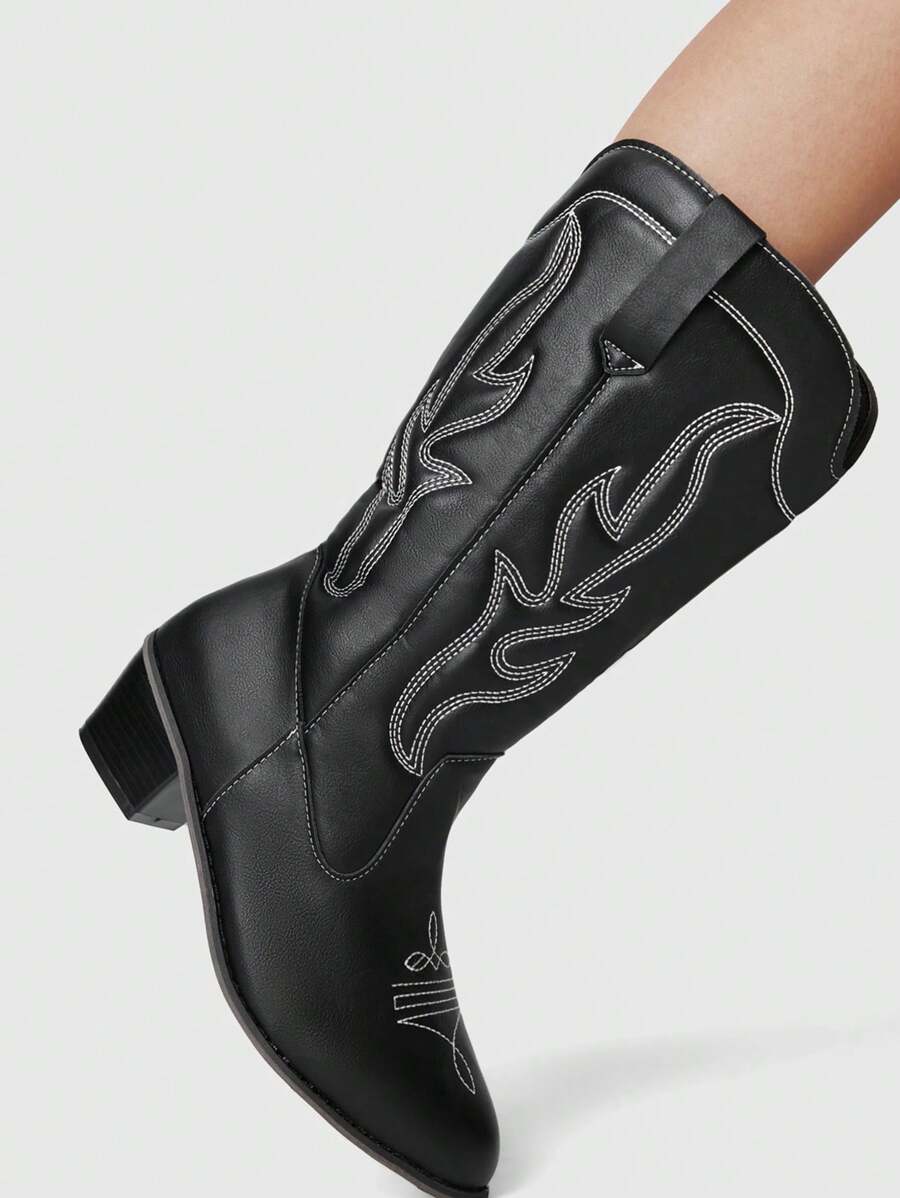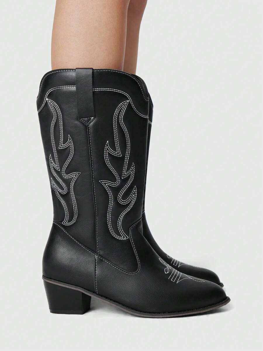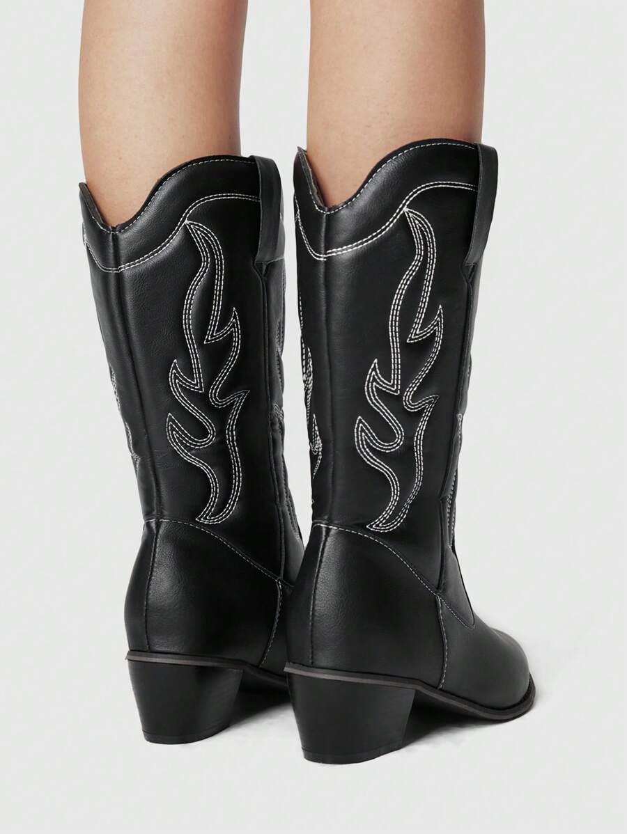 Fairycore Botas de vaquero negras de punta fina y sexy para mujer, botas altas con tacón grueso y bordado, botas de media pantorrilla con tacón alto y corte en V