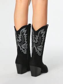 Fairycore Botas vaqueras occidentales de tacón grueso con punta en V retro y bordados para mujer, de corte medio, deslizamiento, estilo de moda para exteriores en otoño/invierno