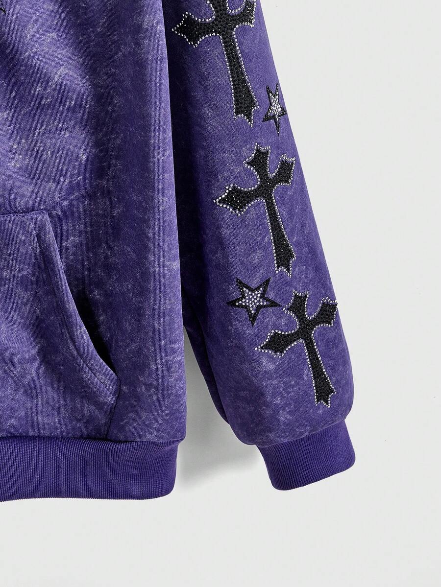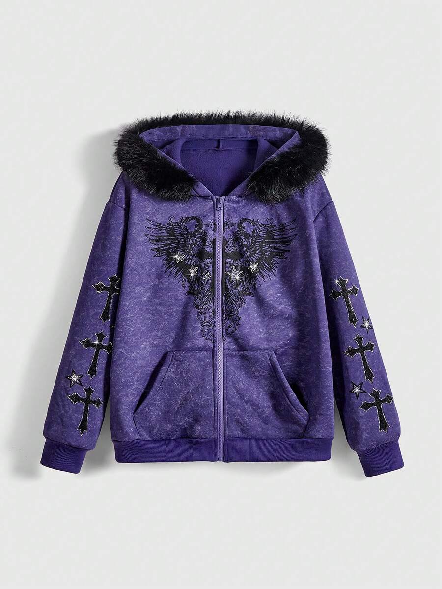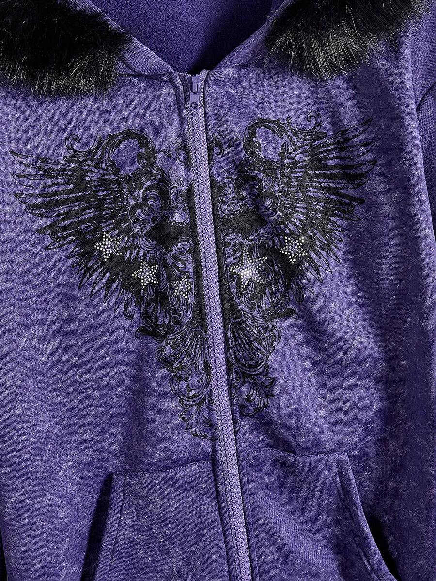Fairycore Sudadera con capucha con cremallera frontal, alas cruzadas y strass, con efecto desgastado para mujer