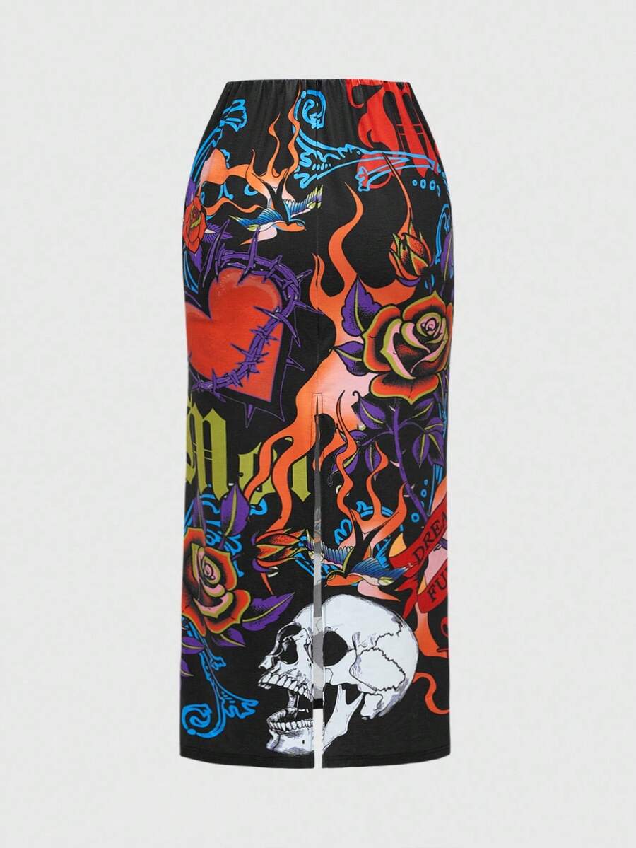 ROMWE Avant Minifalda de mujer con estampado de texto de llama de corazón de esqueleto en estilo retro Y2K