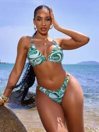 Conjunto de bikini aleatorio con estampado completo y anillo ajustable para playa de verano.