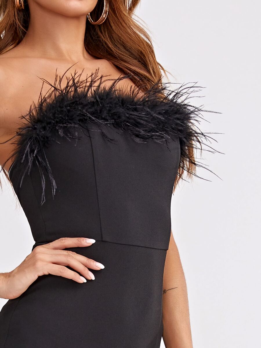 Vestido tubo bajo con abertura ribete con pluma artificial