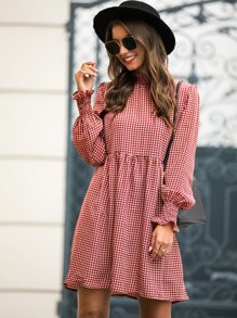 Vestido smock de pata de gallo ribete fruncido