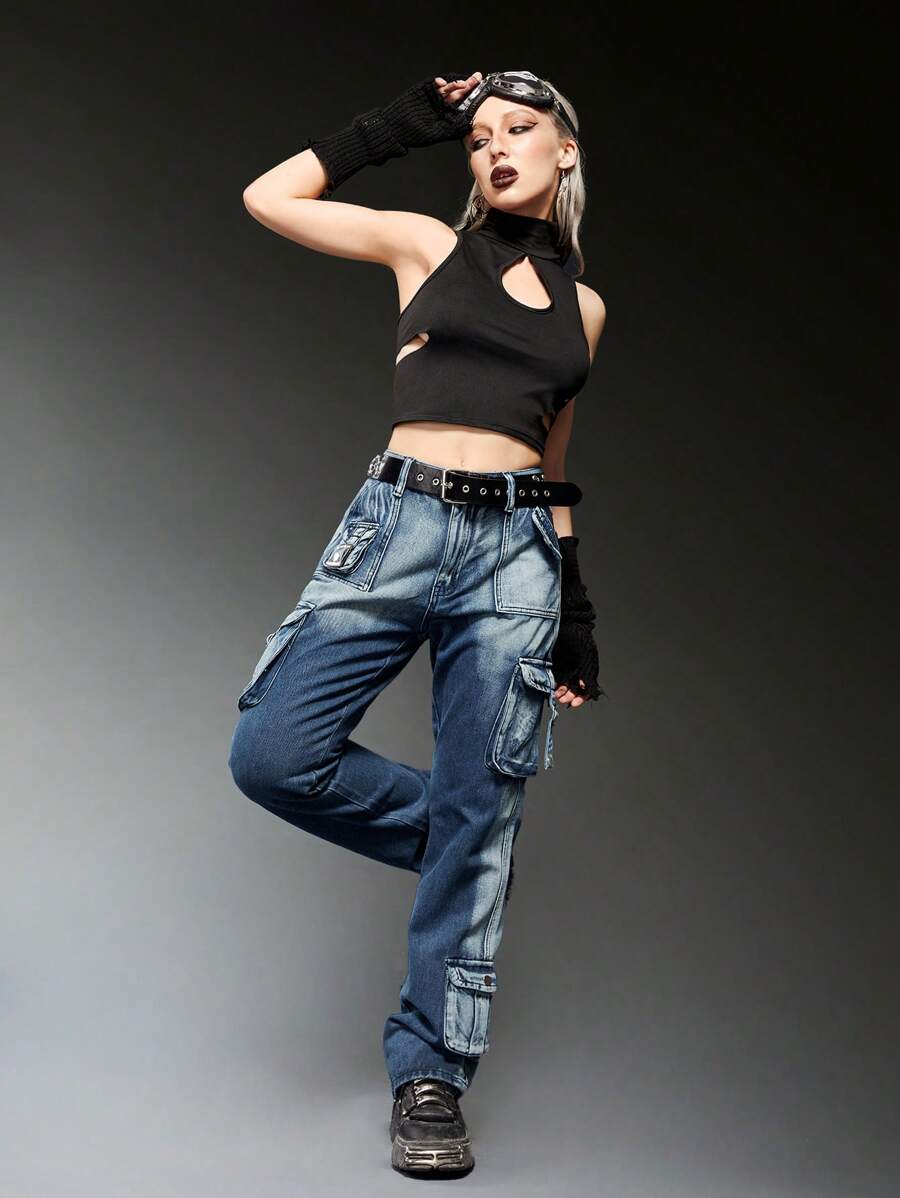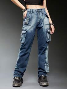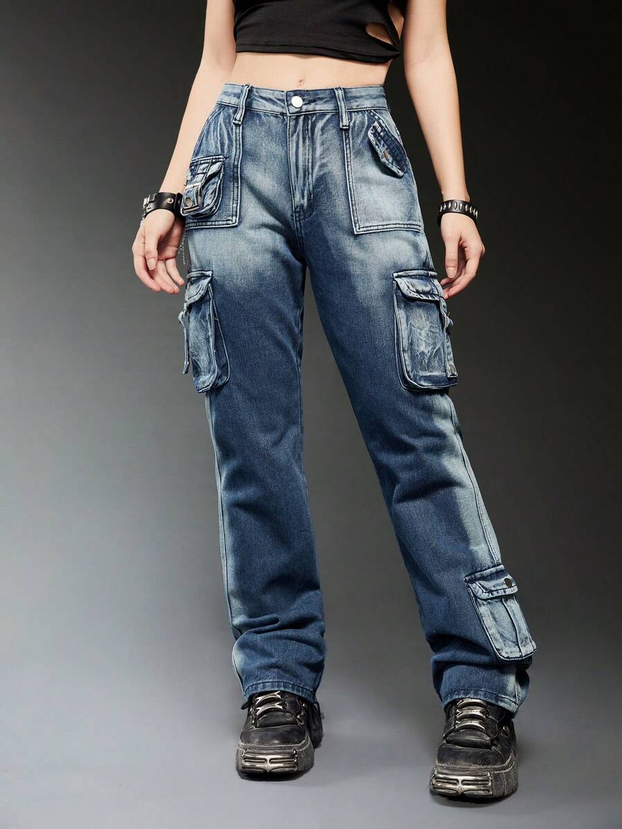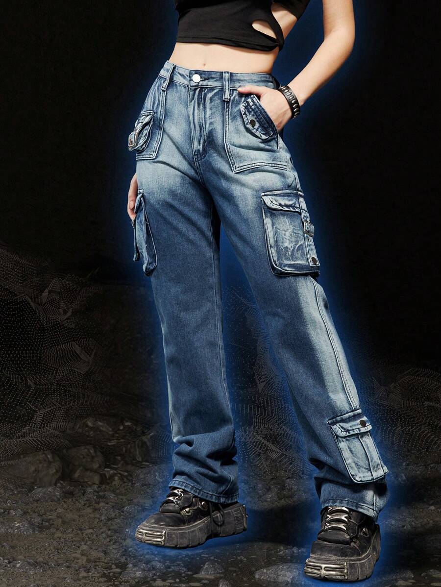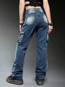 Grunge Punk Jeans cargo con bolsillo con solapa con lavado