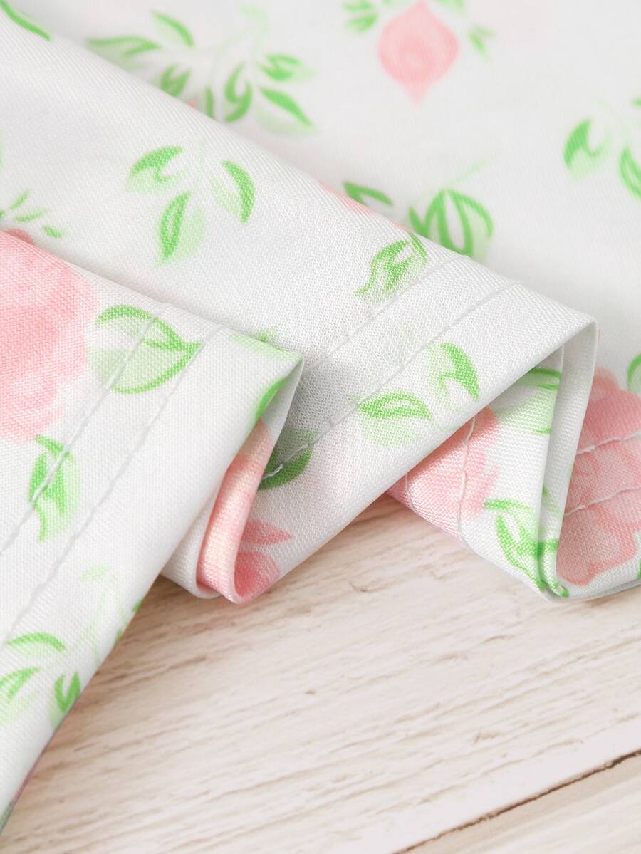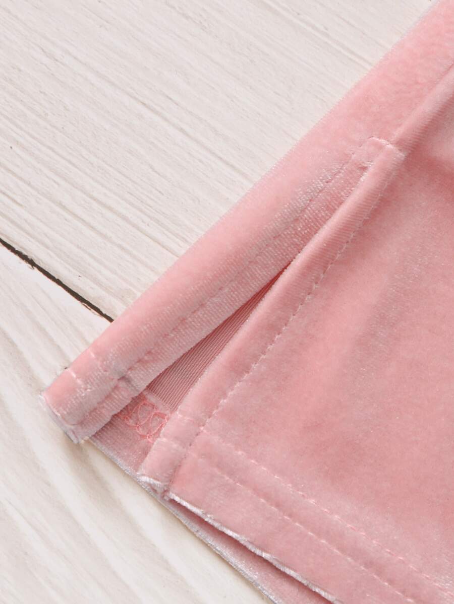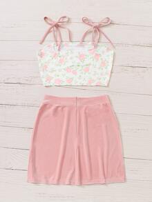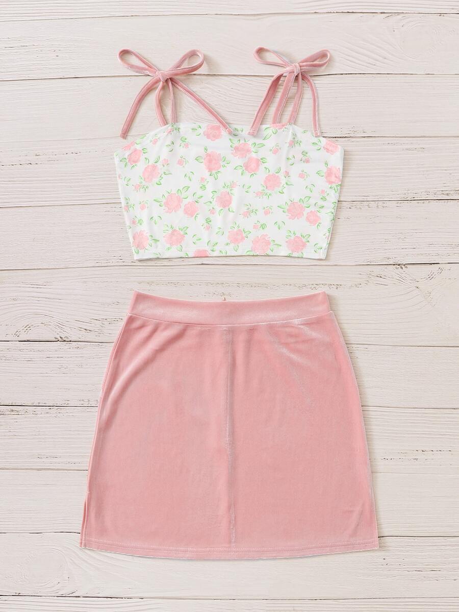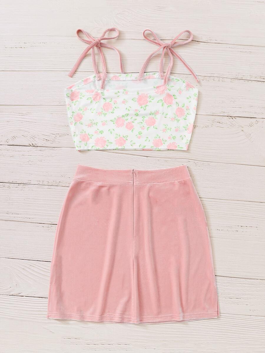 Cami corto floral con falda rosada de terciopelo