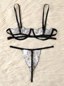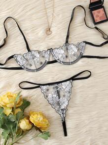 Conjunto De Lencería Con Bordado Floral, Sostén Con Aro Y Tanga