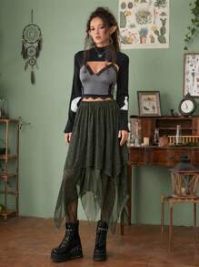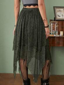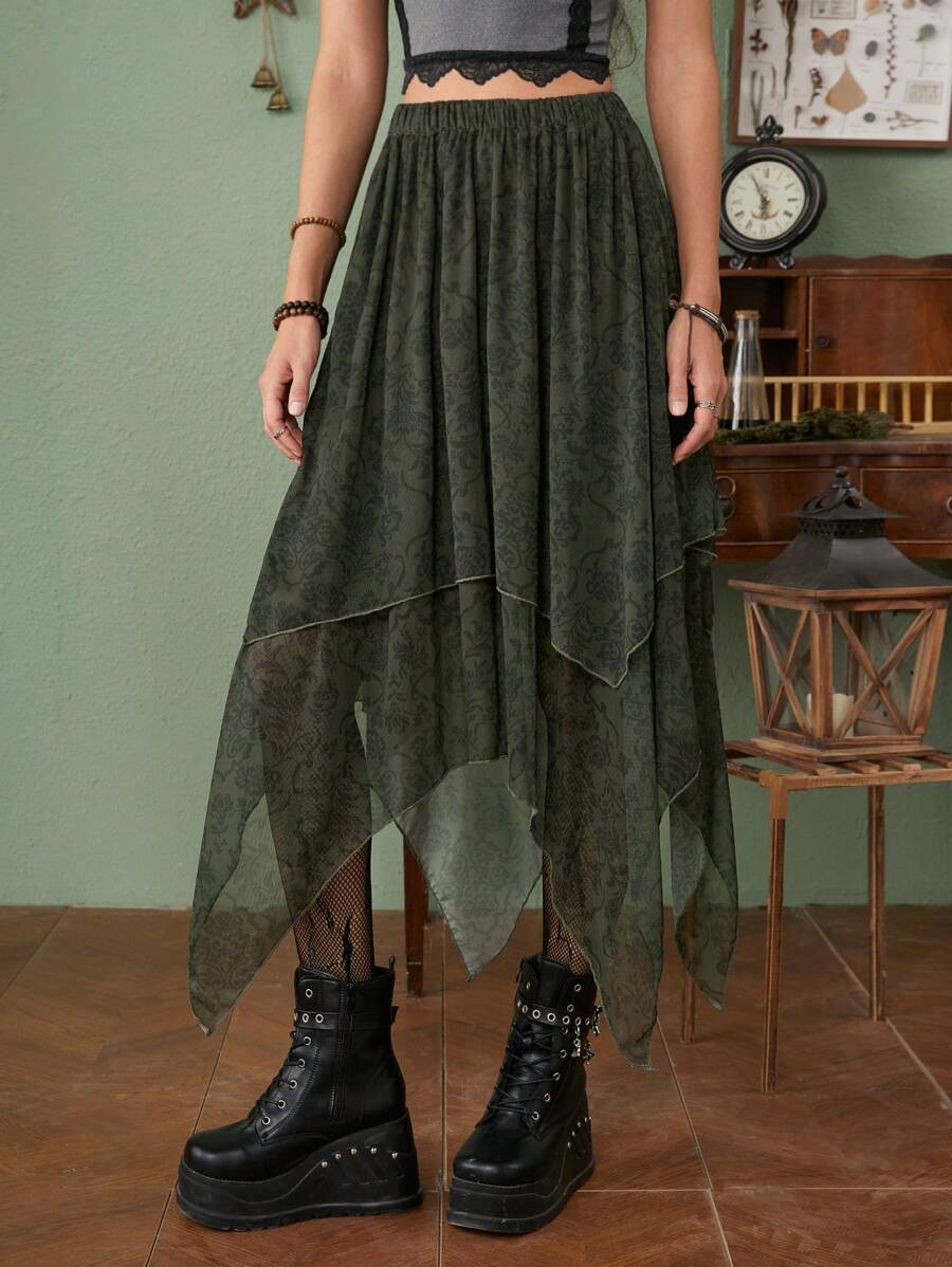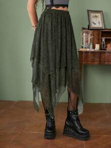 Hippie Falda con estampado floral bajo asimétrico de malla