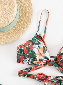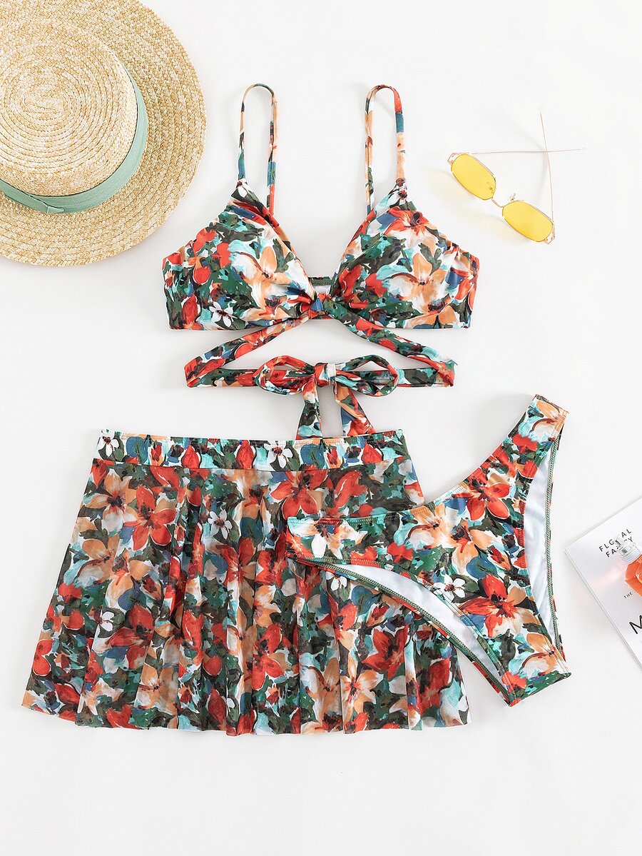 Conjunto de bikini playero de verano con estampado floral, detalle de nudo frontal y falda playera