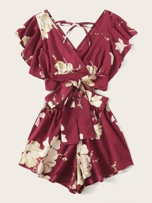 Top de manga mariposa bajo con nudo con estampado floral con shorts