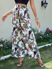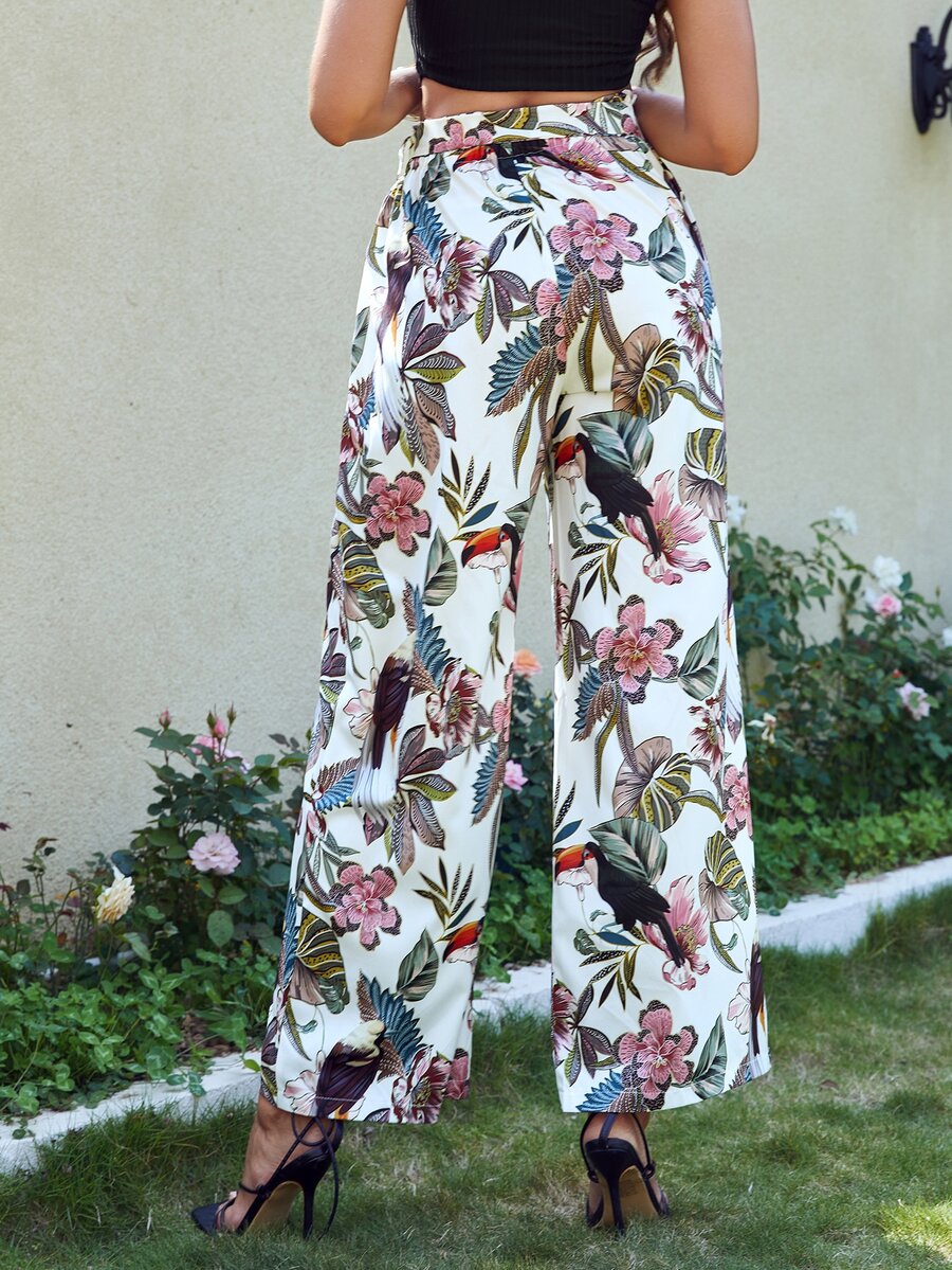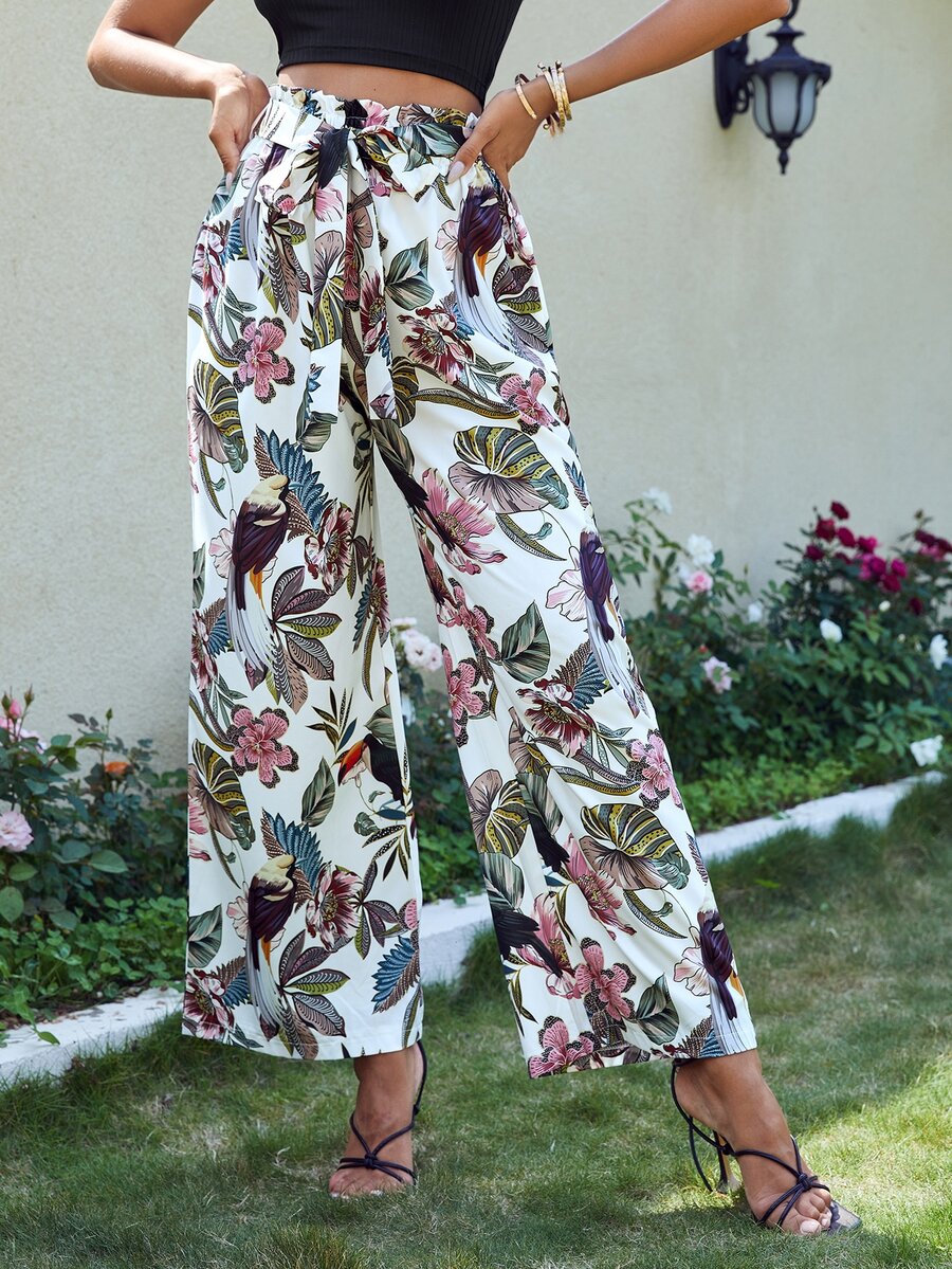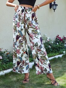Pantalones de pierna ancha con estampado floral de cintura con volante con cinturón