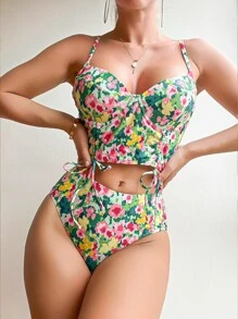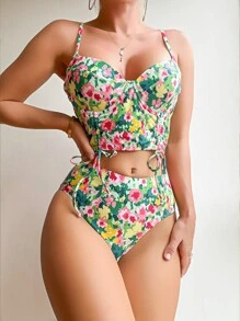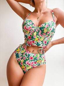Conjunto de bikini de cintura alta con aumento de volumen, estampado floral, para playa de verano