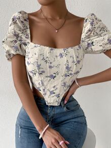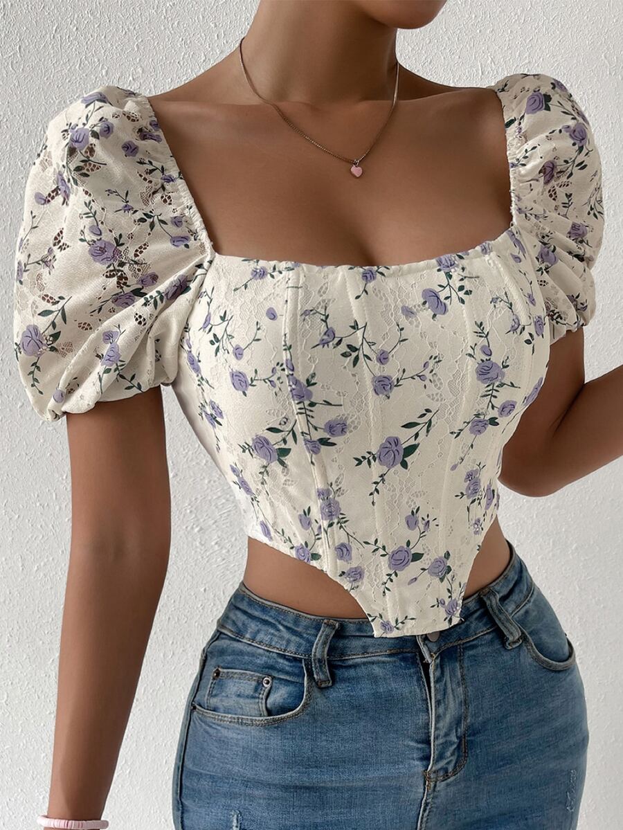 Blusa con estampado floral de cuello cuadrado de manga farol bajo asimétrico con encaje