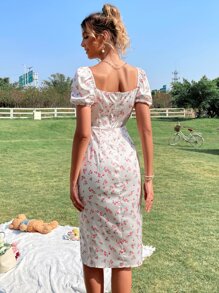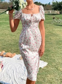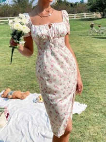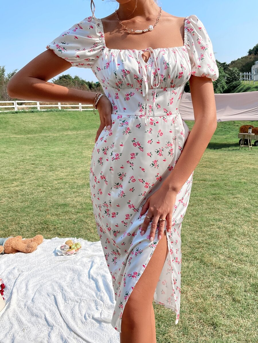Vestido De Satén Con Nudo Delantero Y Estampado Floral, Cuello Cuadrado, Manga De Globo Y Abertura Hasta El Muslo