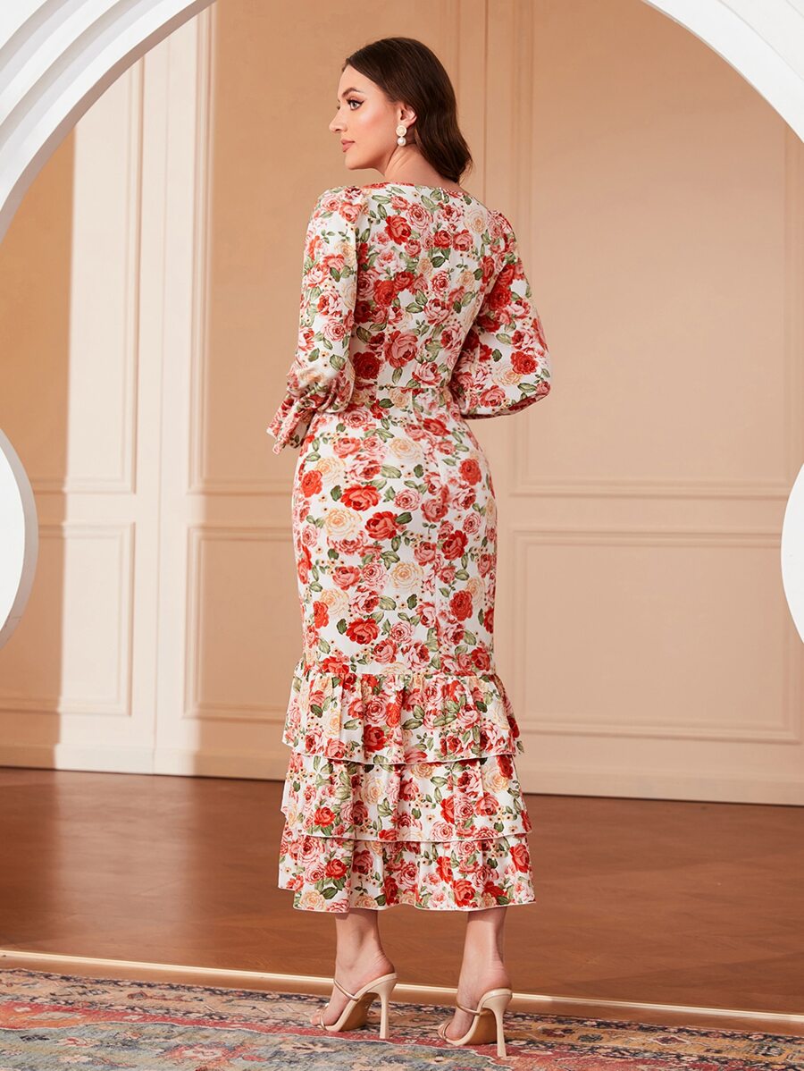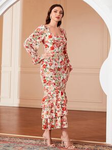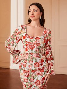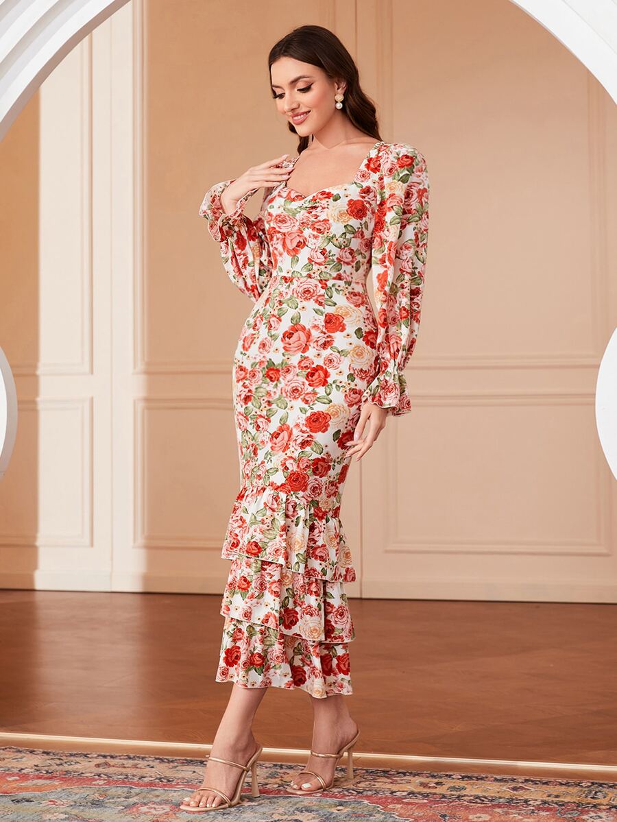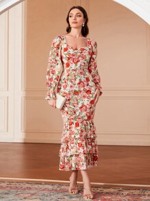 Vestido con estampado floral escote corazón de manga con volante bajo a capas