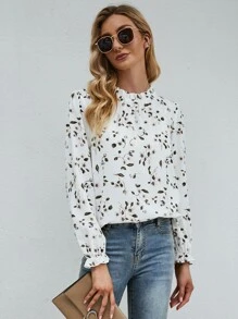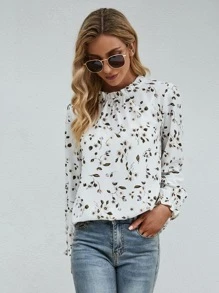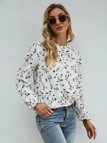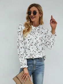Camisa con estampado floral de cuello con fruncido de manga con volante