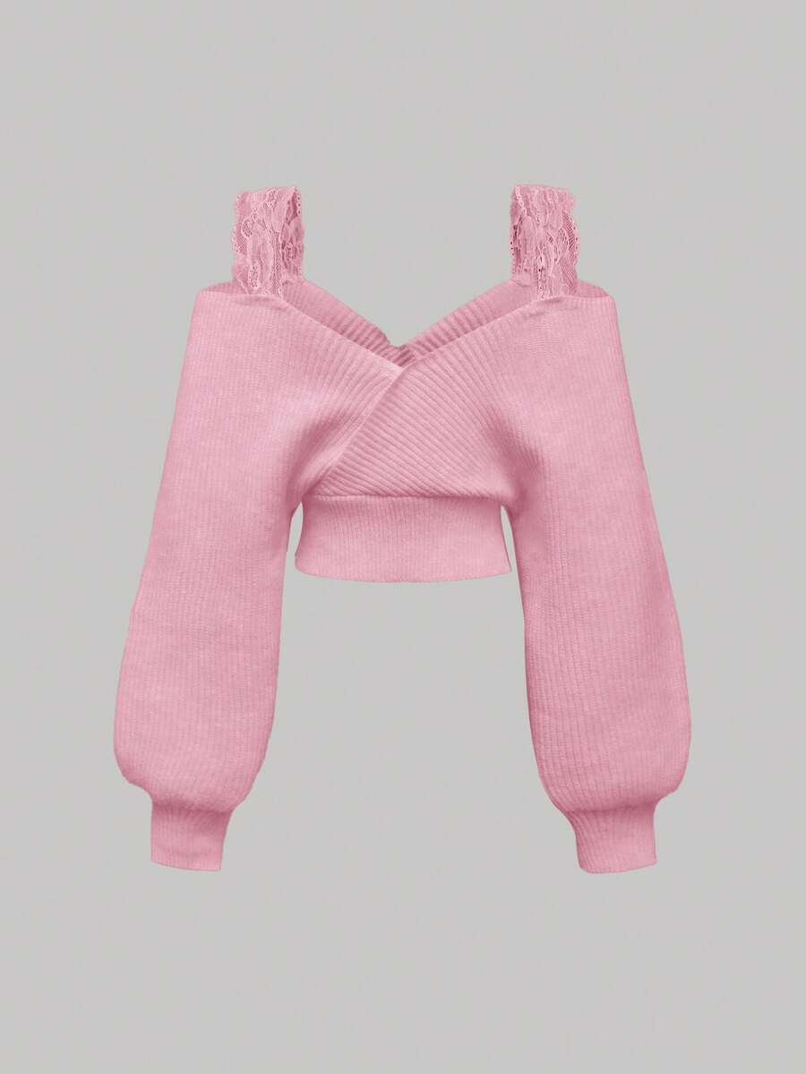 Kawaii Suéter casual sexy francés con tirantes de encaje, escote profundo en V, hombros descubiertos y lazo