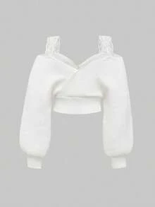 Kawaii Suéter informal y sexy de talla grande con un solo hombro, cuello en V profundo, lazo y encaje