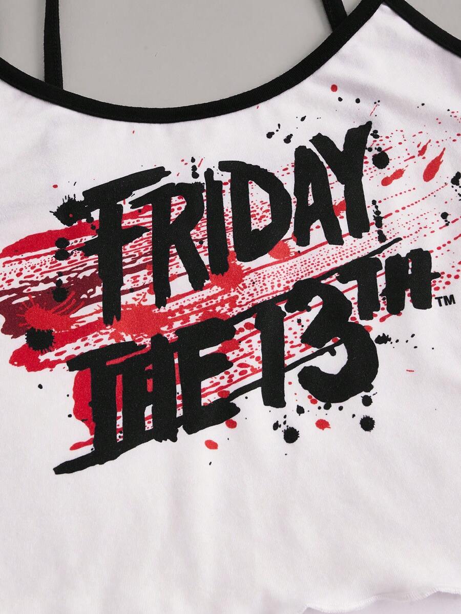 Friday the 13th X ROMWE Pijama con gráfico de calavera de letras, con borde de lechuga, para la escuela