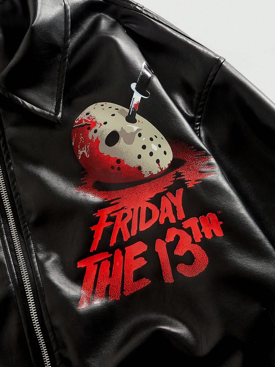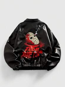 Friday the 13th X ROMWE Chaqueta de cuero sintético con máscara y gráfico de letra para hombres en otoño