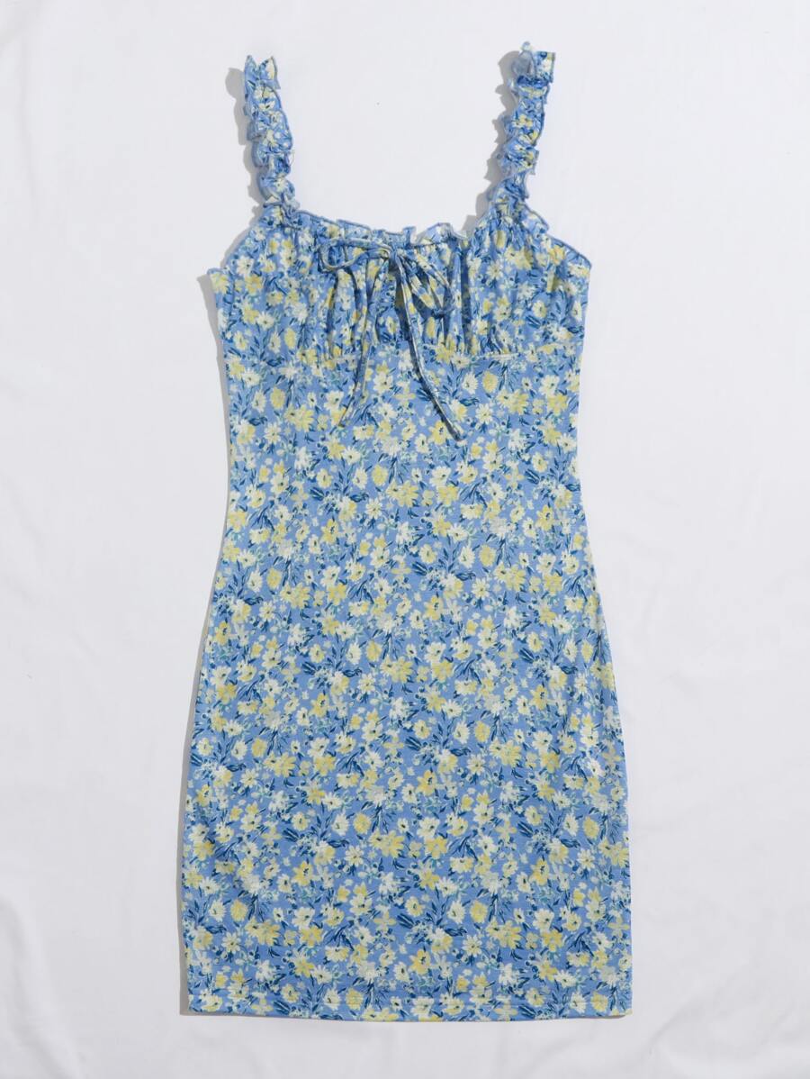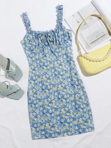Vestido floral de margarita de pecho fruncido con nudo delantero ribete fruncido