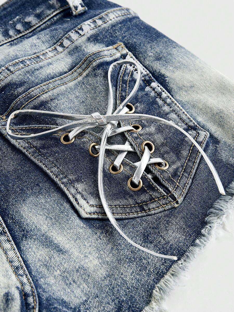 Shorts mini con cintura de cordón y estilo vintage desgastado con lámina de plata, estilo señorita