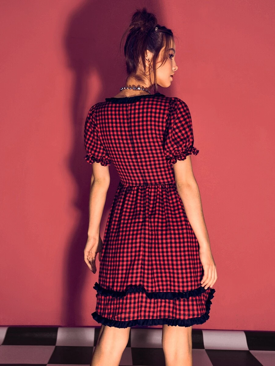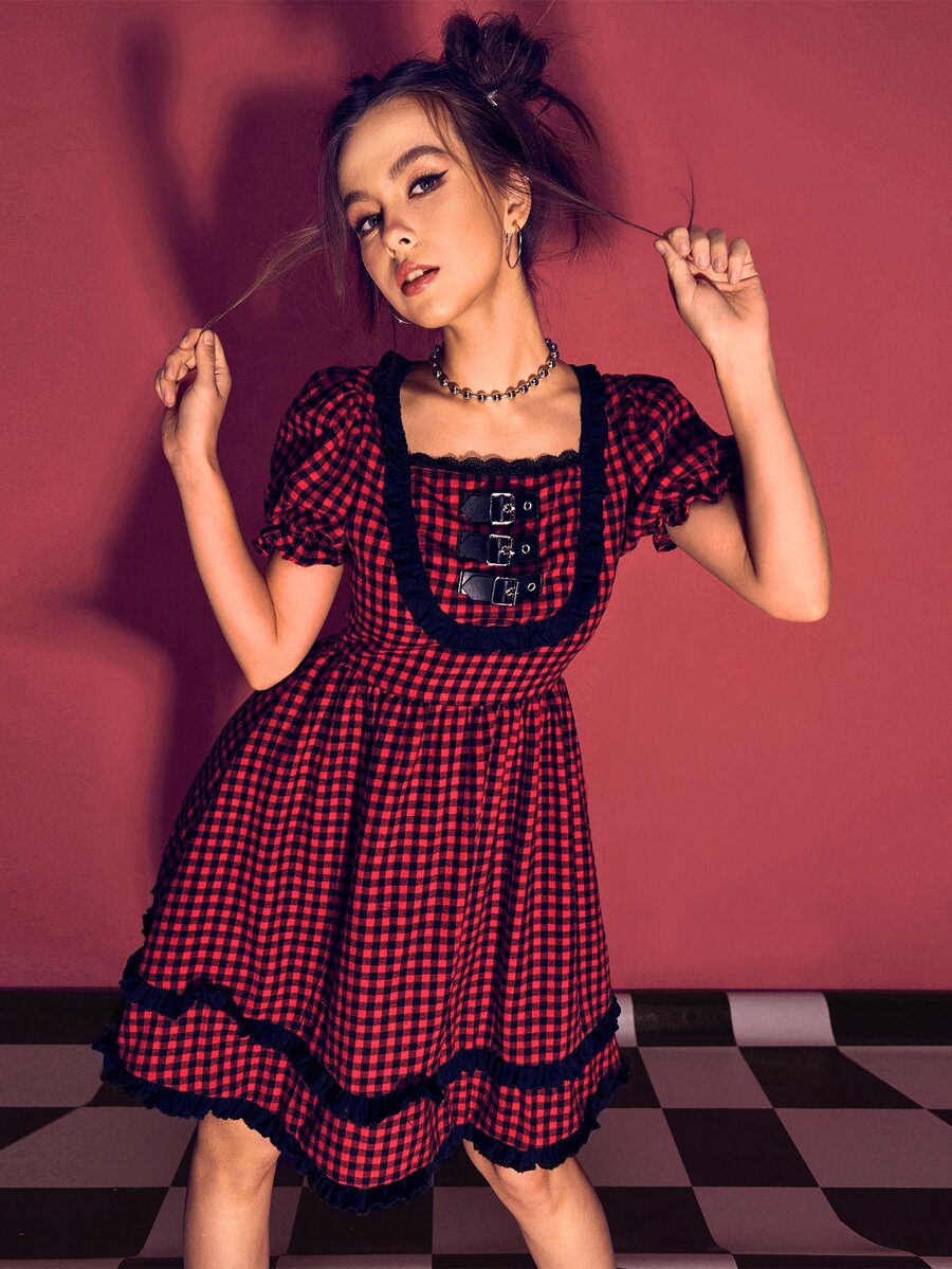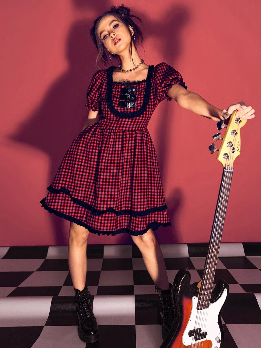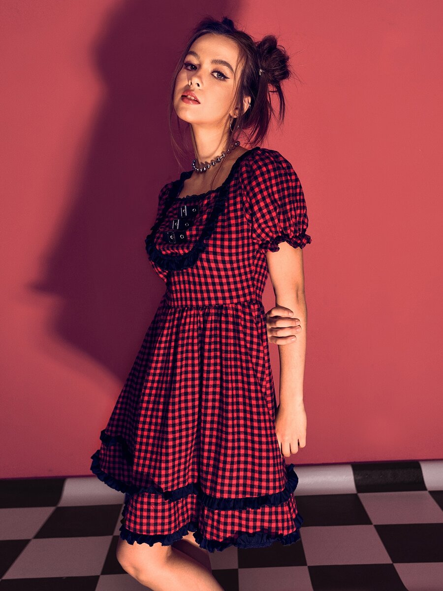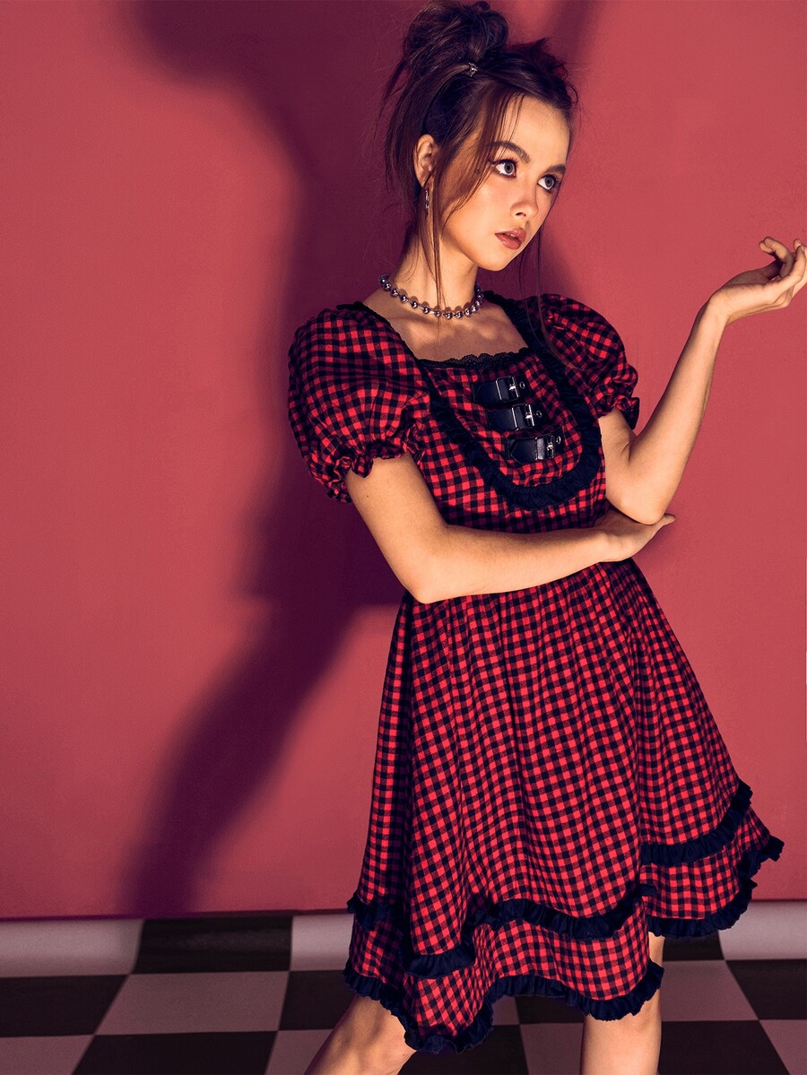 Vestido de guingán ribete fruncido con hebilla
